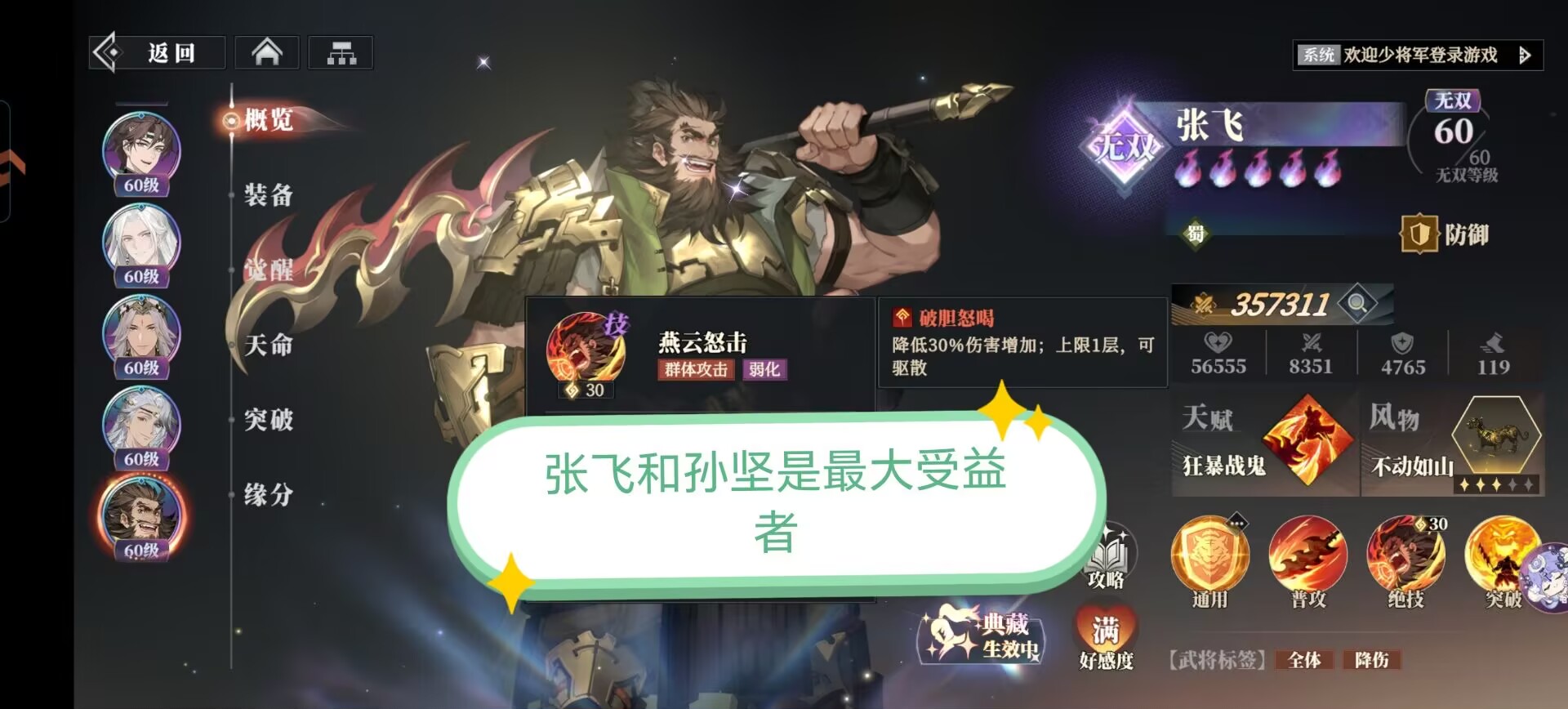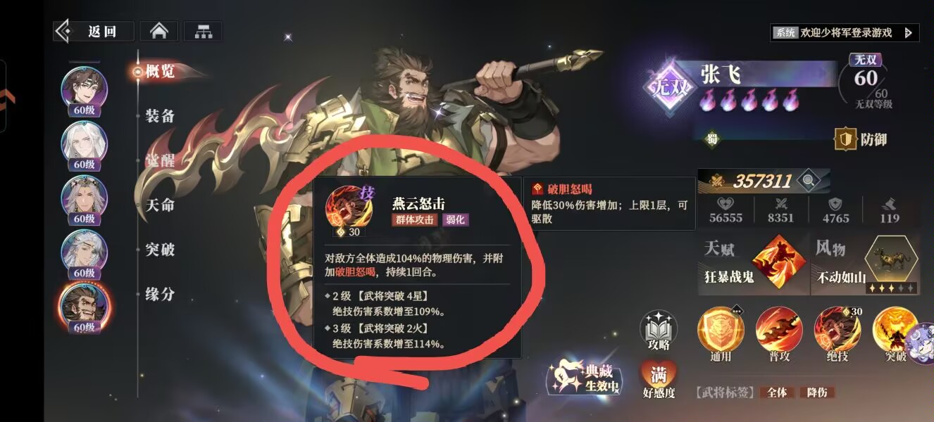 ①张飞:绝技全体怒吼可以给敌人挂上【破胆】降低伤害的负面,刚好和这个风物适配。