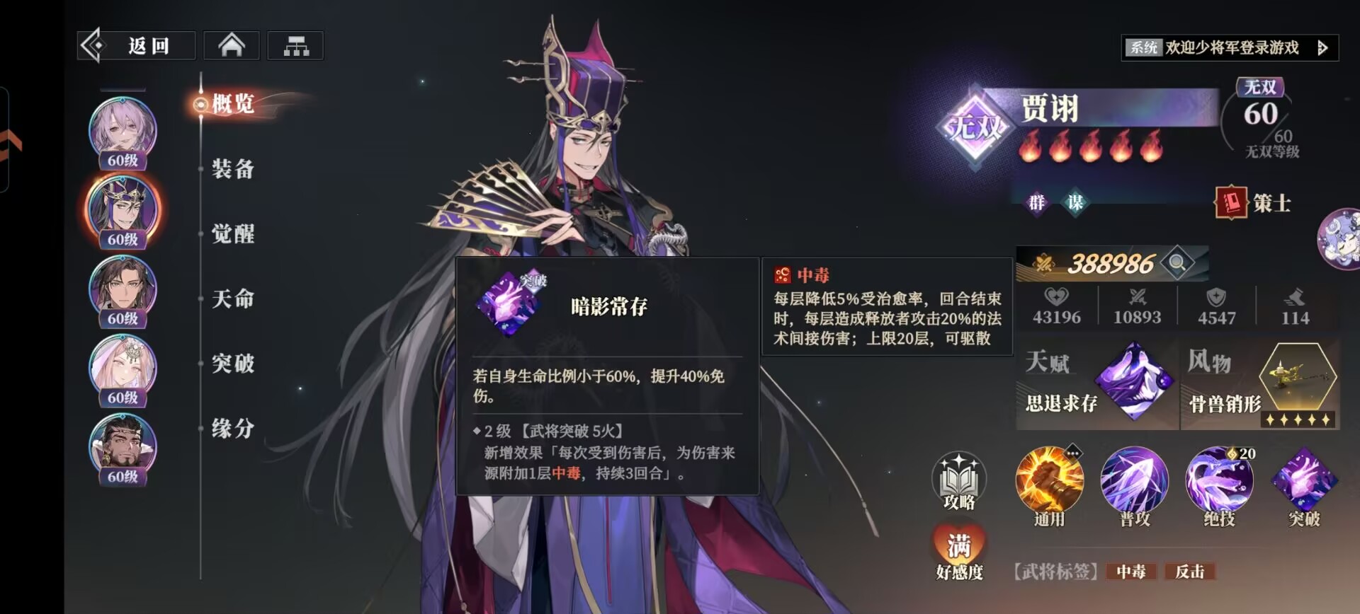 贾诩被动自带40%的免伤加成,配合这个风物20%的免伤加成。免伤可以达到60%,同时还可以施加中毒减益,能够很好的触发分摊伤害的效果。