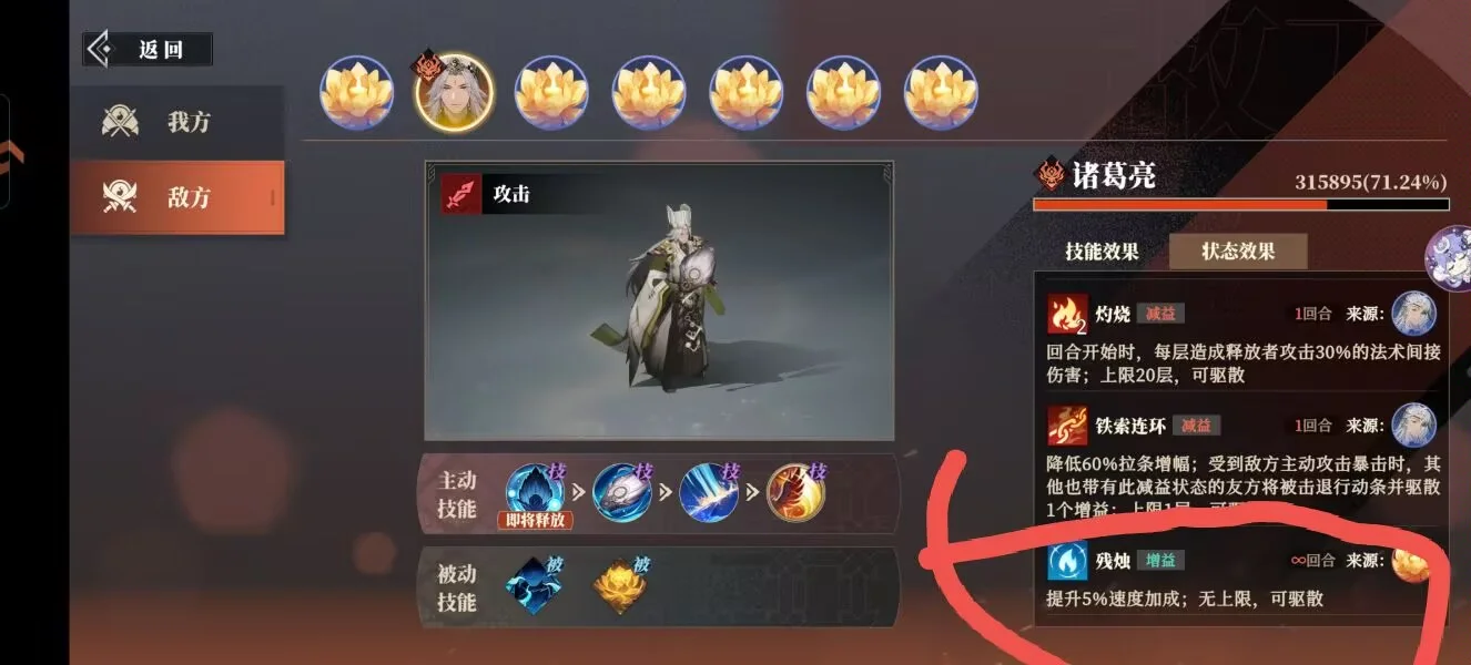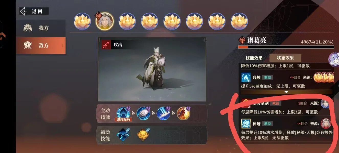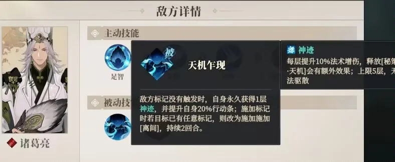 诸葛亮给我方武将释放上面三个标记的技能,如果标记效果被我方破除,没有顺利触发的话诸葛亮就会自身永久获得1层神迹+提升20%的行动条。