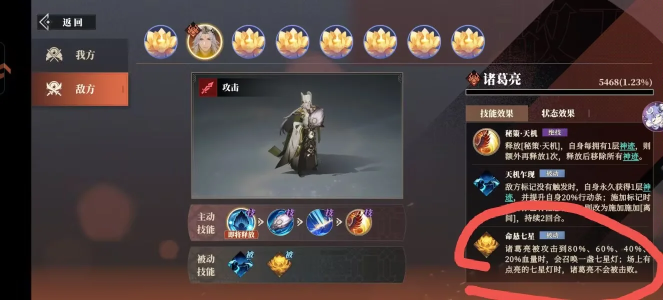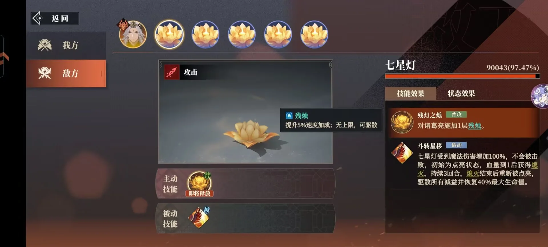 七星灯被我方击败的时候,3回合就会重新以40%的生命复活!经常会出现这几个七星灯打完了,结果那边的七星灯又复活,导致诸葛亮一直死不了!