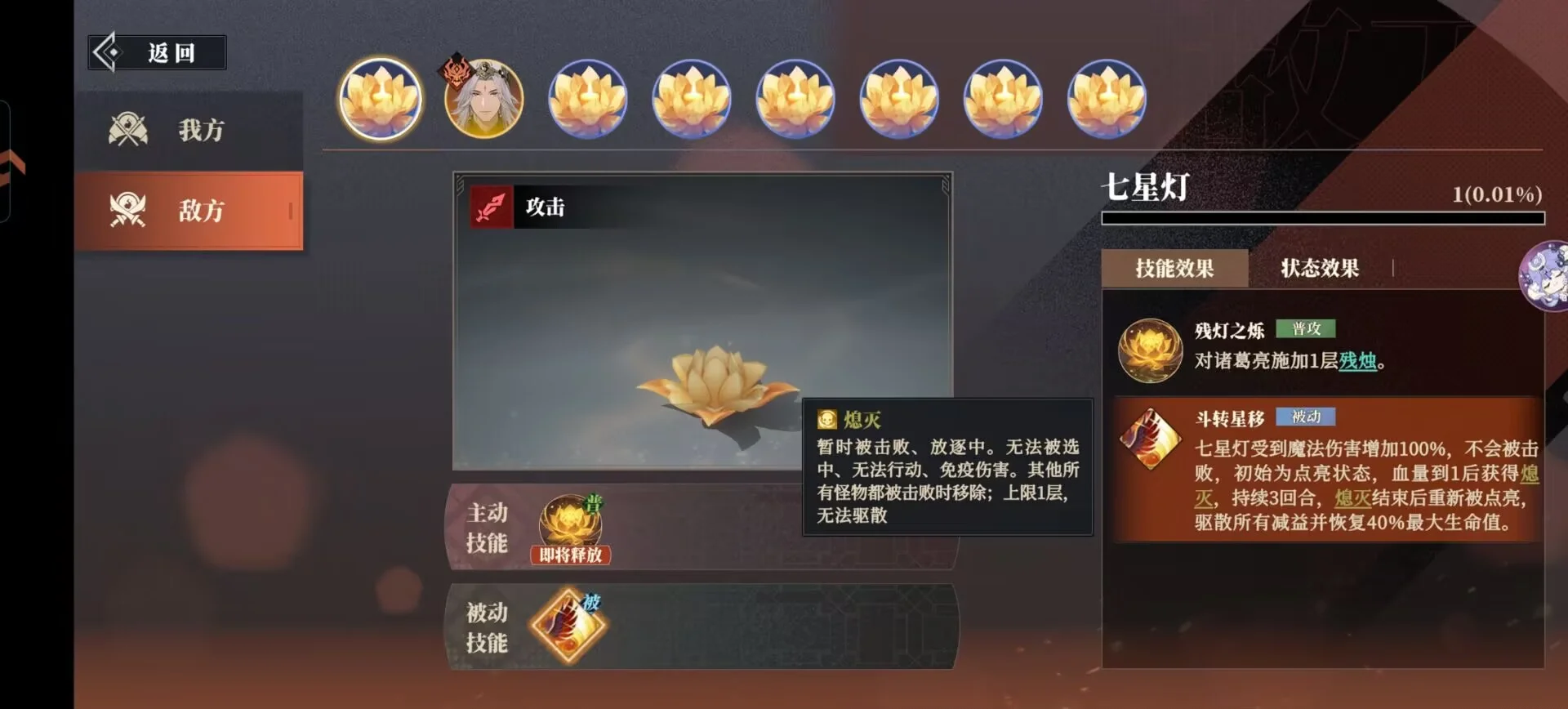 七星灯被我方击败的时候,3回合就会重新以40%的生命复活!这几个七星灯打完了,结果那边的七星灯又复活,导致诸葛亮一直死不了!