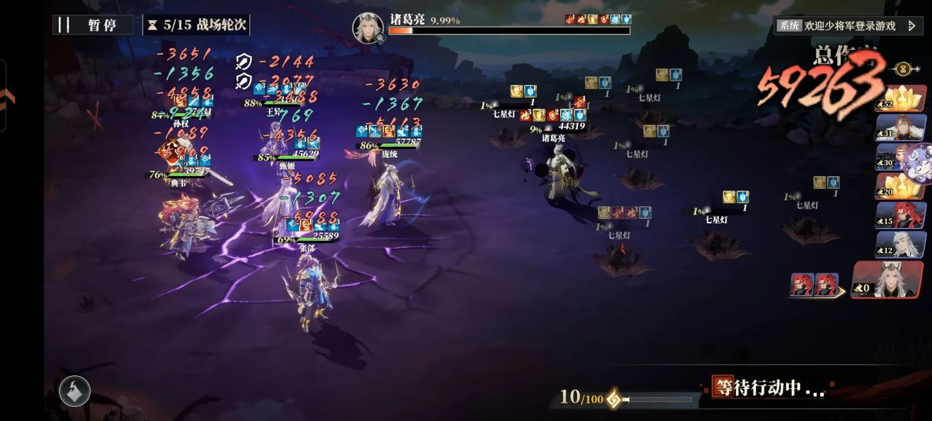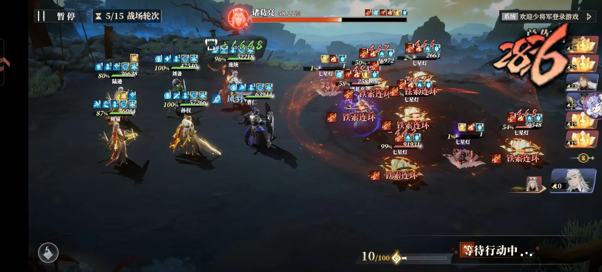 解析:庞统不需要高练度,低练度即可,主要也是起到一个全体挂铁索buff,可以降低诸葛亮的行动条和增益,其实有没有庞统都行,没有换成周泰、诸葛果即可。ok。接下看阵容的搭配。