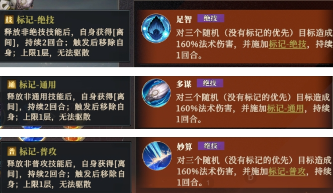 1、诸葛亮技能1-3(足智、多谋、妙算):随机3个目标单体160%伤害,优先攻击无标记的目标,并对其施加标记-绝技/通用/普攻,被标记目标释放非绝技/通用/普攻技能后获得1层【离间】。