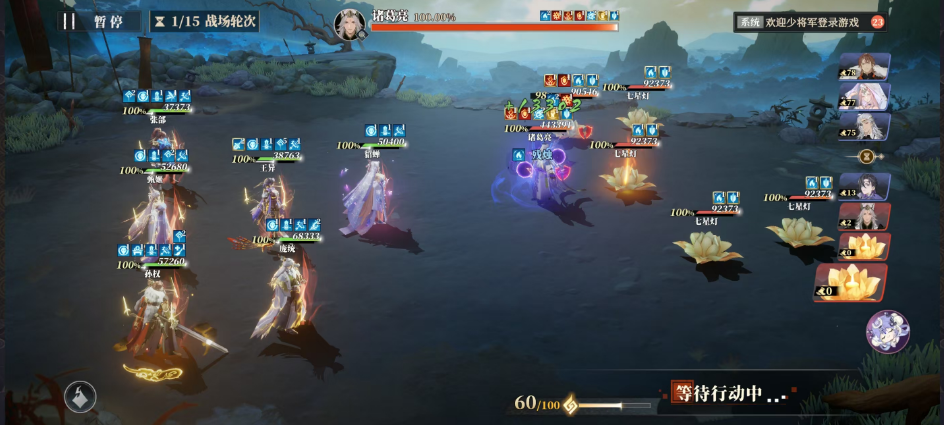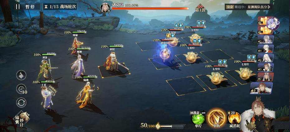 1、【处理七星灯】:场上只要有七星灯点亮,诸葛亮就不会被击败,因此压全场七星灯血线是本轮韬略第一要务。在此基础之上,在诸葛亮低血量时,一定要保证所有七星灯血量均为1处于熄灭状态,才能击杀诸葛亮进入下一轮。