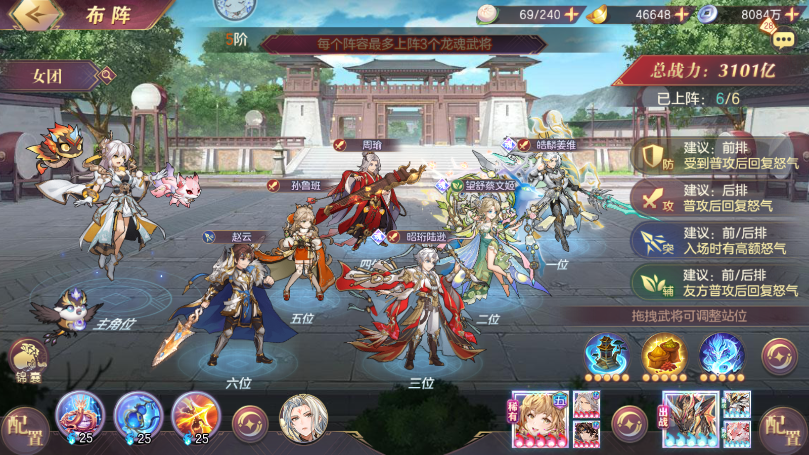 ③但是值得一提的是,命魂赵云登场以后,对枪灵和新无双灵宠闭月鸟的需求更大了,简单来说就是有和没有的差距拉大了,有高星无双灵宠和枪灵的话,5蜀阵容会更稳,没有带吕布保一下稳定性更好。
