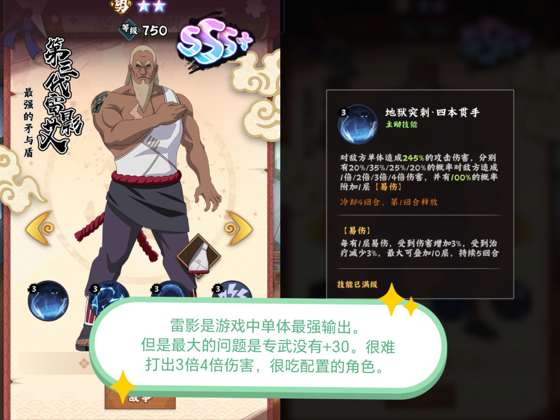 因此专武+30的极限雷影伤害是>奇拉比、卡卡西的。
