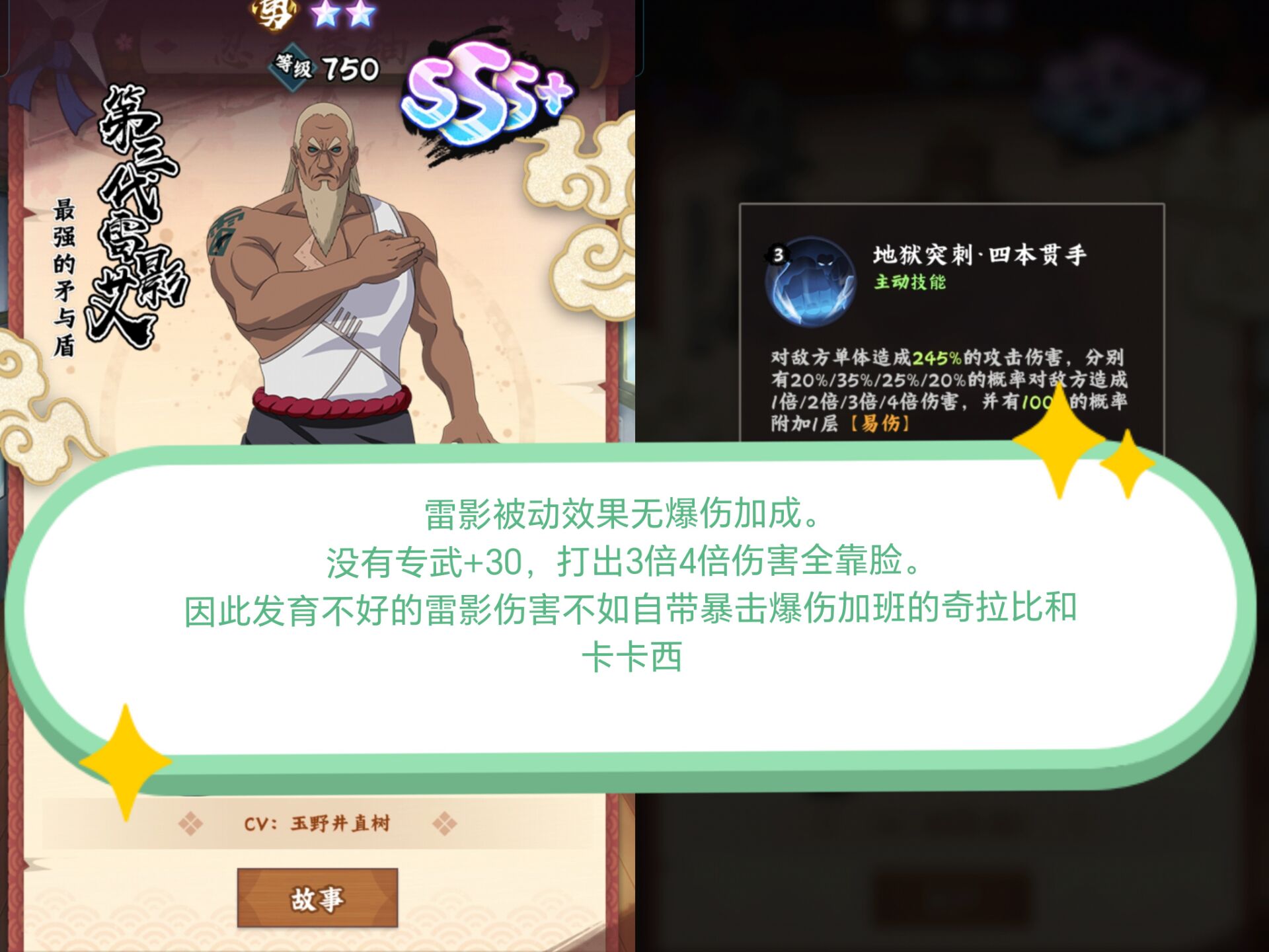 加上雷影的被动技能是没有加暴击和暴伤的。不像奇拉比和卡卡西有额外的高暴击加成,所以如果只打出2倍伤害的雷影整体伤害没有奇拉比和卡卡西高。