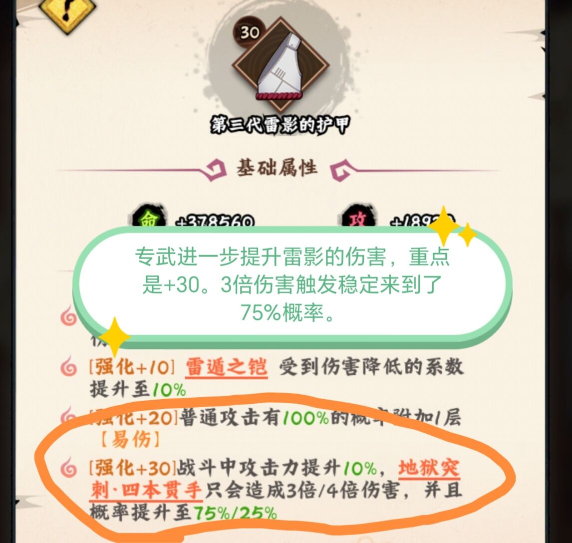受到伤害提升三代雷影的攻击10%和20%防御也是进一步雷影的作战能力。
