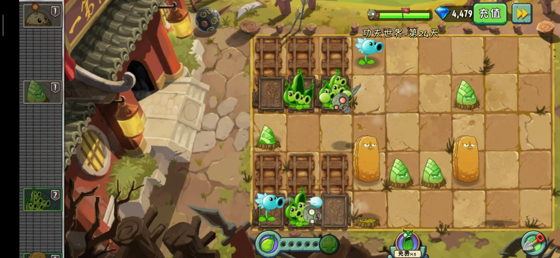 剩下的植物,高坚果种植的位置要稍微靠右一些,一来是拖住僵尸的脚步,二来则是给竹笋留出种植空间。土豆地雷就种植在高坚果的后面,等到土豆地雷长出来后我们可以暂时不管那一排,土豆地雷的伤害秒天秒地,并且豌豆系射手的攻击也不能穿透,所以就算攻击僵尸,没有打死,还让他触碰了土豆地雷,那就得不偿失了,还会耽误其他排的防御。而仙桃可以治愈植物,同样可以放在高坚果的后面,因为土豆地雷和仙桃出现的频率并不是很高,足够分配了。