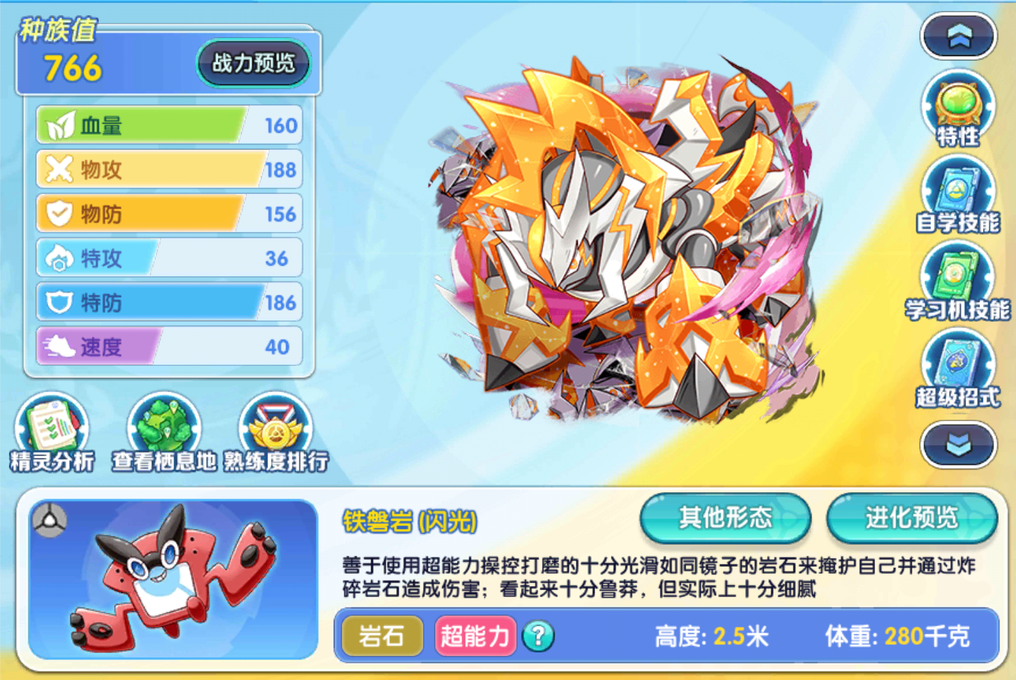 性格:固执、勇敢、开朗,努力值:血量物攻、速度物攻,道具:火炬杯锁链、团结之刃,特殊系统:超级岩石轰击