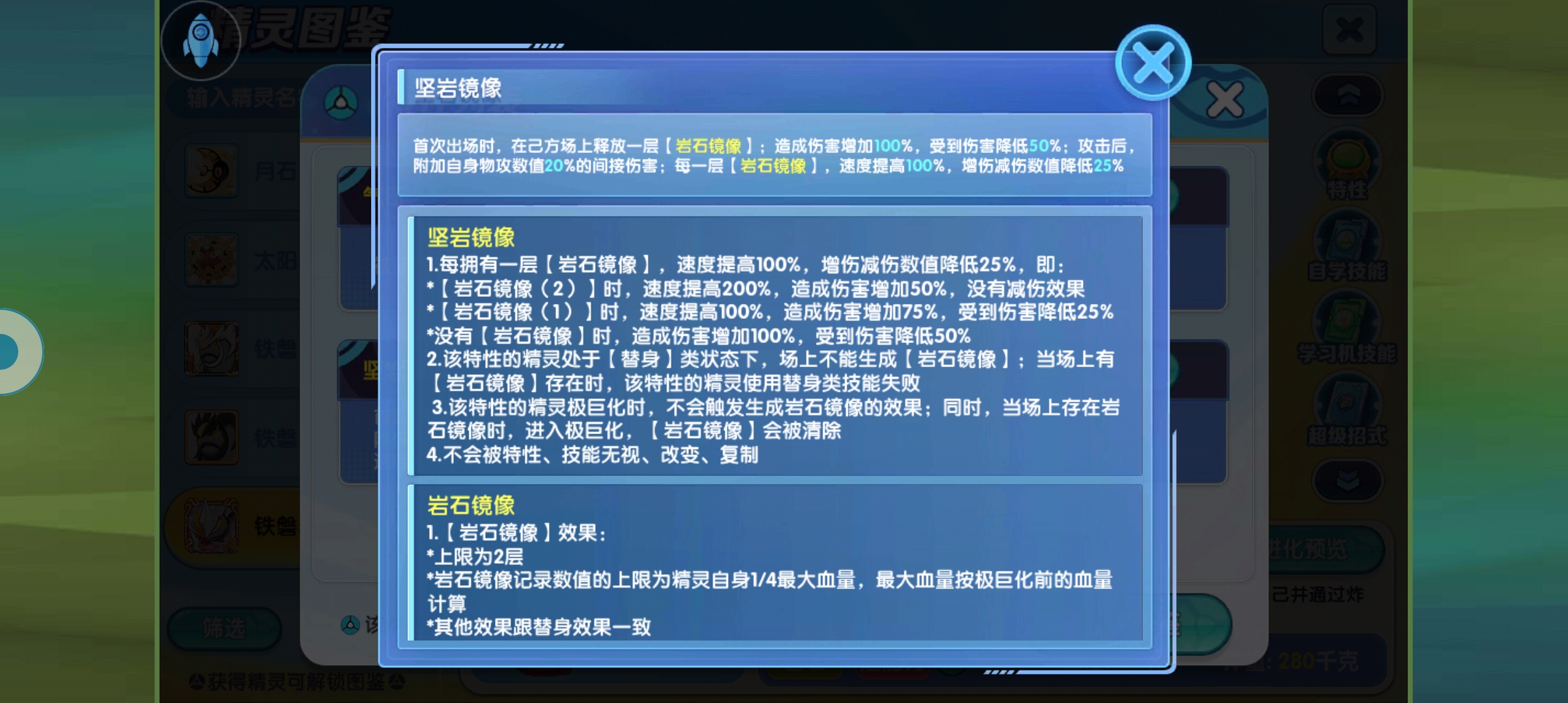 自身特性的话,是自身首次上场的时候给自己释放一层岩石镜像效果,大家要记住,如果一个特性上面标注【首次上场】那么基本上就代表这个特性,它是属于一次性效果,后续一旦被对方解决就很难再拿回来,拥有该状态的时候,会根据层数提升对应的能力,其中当两层镜像全部消失之后,自身的伤害就会提升100%,受到的伤害减少50%。别看自己属性差,有特性在兜着底呢,拥有一层的时候可以速度提升200%,那么基础速度是7709,那么如果配合200%的速度的话,基本上可以快得过很多的辅助,甚至是低速的输出手,如果有一些玩家极端的话,也可以走开朗,然后把所有能加速度的,东西全部提升,在速度方面也是可以的,就比如说努力性格还有战术,甚至是共鸣,所以我在前面才说了,如果共鸣搭档有速度的话就更好了,缺点的话就是自身的防御力可能会下降很多,如果对方打掉自身的镜像一层,那么如果只有一层了的话,就可以获得25%的减伤,并且伤害提升至75%,速度降低100%,那么还有100%的速度,也就是说,用本身不应该得到的速度去换取的更高的减伤和更多的输出能力,因为本身就是一个大傻个速度值,只有40种族值是正常的,那么,它的镜像效果是什么样的呢?答案很简单,就是一个替身效果