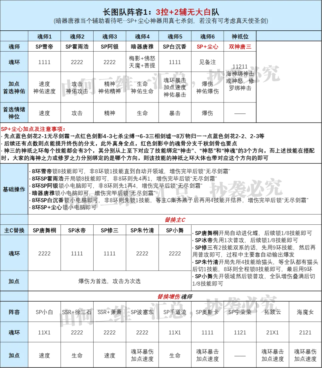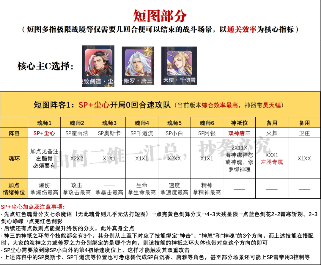 首先在短图部分,目前基本上就是清一色的SP+尘心队伍,但是这个队伍有个前提,那便是必须拿到SP+尘心的左腿骨才行,当然一旦拿到目前短图的最强爆发魂师也是非他莫属,大概的搭配思路是利用SP霍雨浩的神位特点,在激活7大神位下,再利用SP小白的双倍主C爆发辅助与第1回合快速拉条后的辅助爆发,基本上在很多0回合或2回合的战斗中,这个队伍的伤害还是相当够看的,此外短图的防辅系凶兽魂环还请大家带上“三目紫金虺”,其增伤能力极为恐怖。