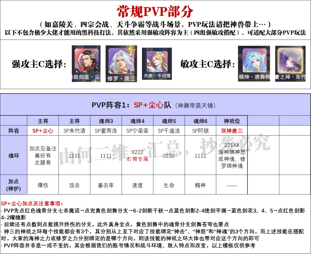 最后则是PVP部分......这部分就更没啥悬念了,之前有朋友说感觉SP修三的PVP能力要比SP+尘心更强,其实这点就看咱们怎么考虑了,毕竟SP+尘心是连SP唐昊都限制不了的男人,所以大家觉得哪个更强就用哪个的阵容即可,反正今天的一图流阵容汇总攻略中,强攻系的SP+尘心、SP修三、SP唐昊和SP千仞雪,敏攻系的SP唐舞桐、SP朱竹清、SP小舞和卫庄都角色维一都给大家列出来了,大家想怎么选就怎么选即可,而维一个人目前角色SP+尘心和SP朱竹清的强敏攻搭配是相对最强势的。