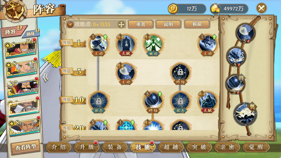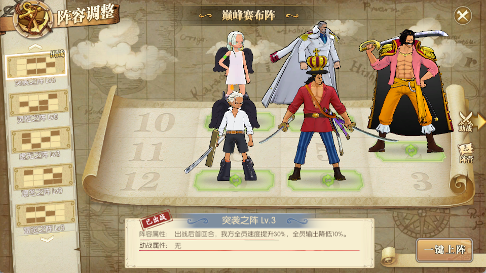 阵容的话现在的版本比较单一,全部都是通过卡普带动团队速度的,主力输出还是鹰眼,控制是小女帝,挂件是御田加罗杰或者白胡子!