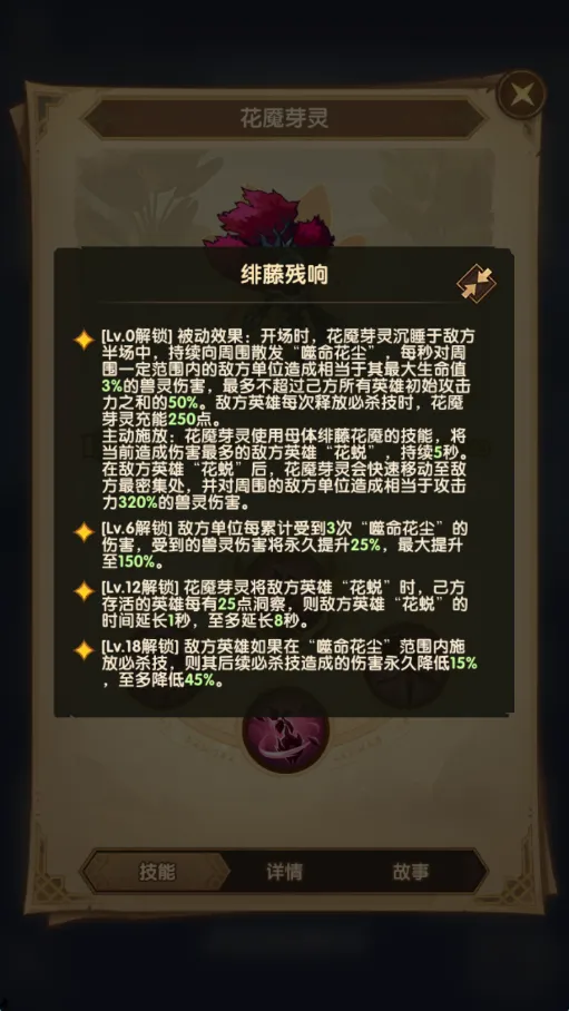 ◇简述:花魇芽灵在战场上持续散发花粉对周围造成伤害,还可以将敌人变成花蜕来限制其行动。