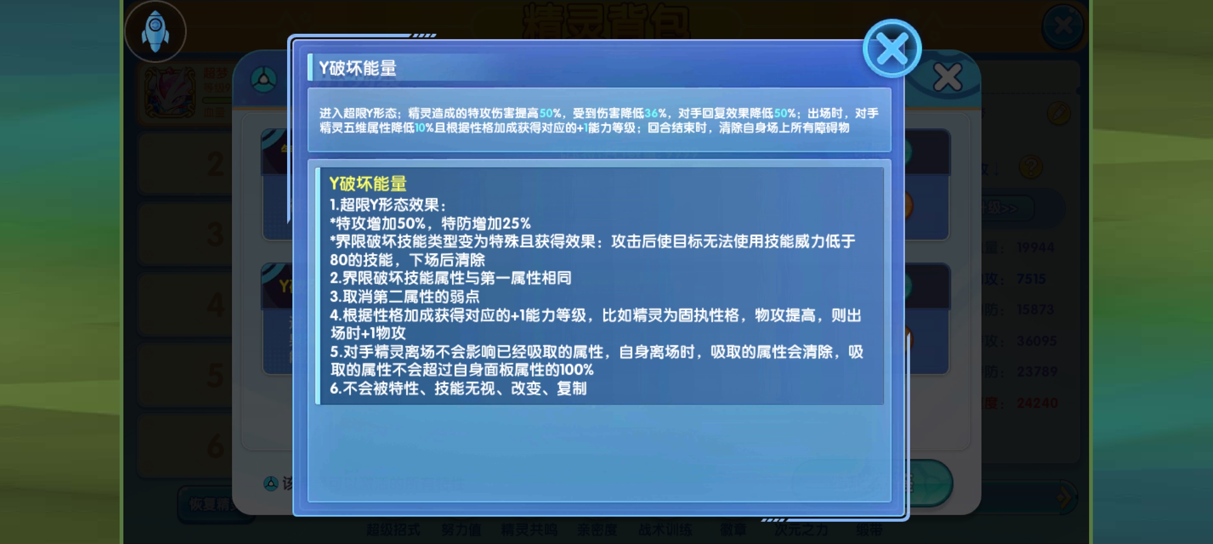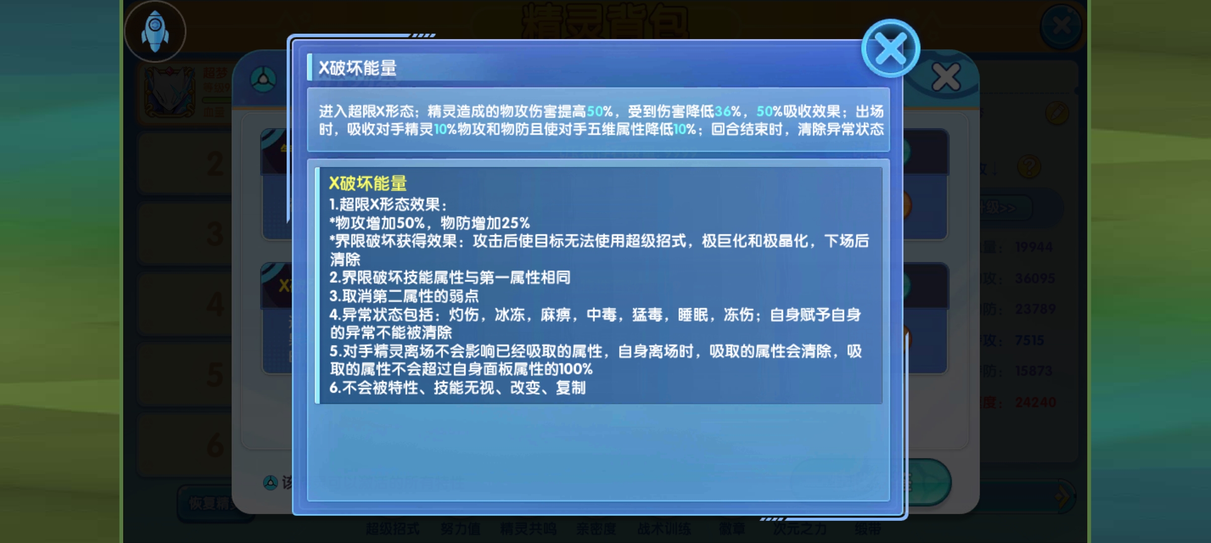 大家可以理解为这个特性是究极超梦,分别分开的属性,然后给了x和y两种形态,首先,x的特性最关键的就是在于它可以解除异常状态,是一个非常利己的特性效果,因为一般来说一个输出受到异常状态之后,就会陷入负面效果,那么这个时候想的最多的就是赶紧要下场,然后重新上场进行调整,但是超梦破坏x不会拥有这方面的担忧,因为它可以自动解除状态,所以作为一个输出来说,能够持续站场就是显得相当关键了,而超梦破坏x就拥有这个能力,至于其他效果的话就是加伤和减伤,不过这个加伤是直接加到面板上面的可能会导致战斗力虚高有点不好这方面。