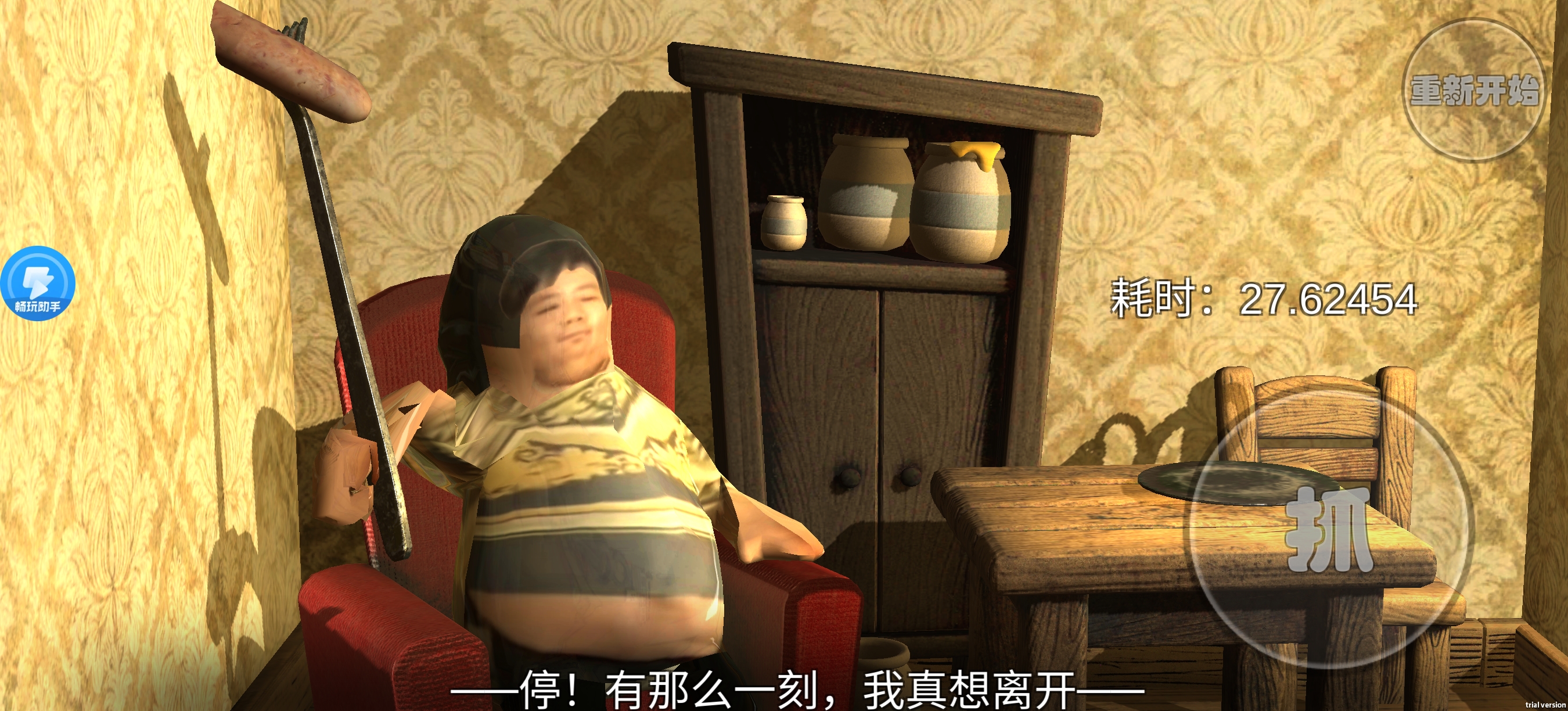 攻略就是把桌子下面的那个罐子砸碎再那叉子一点一点扒拉 扒拉到身前就行