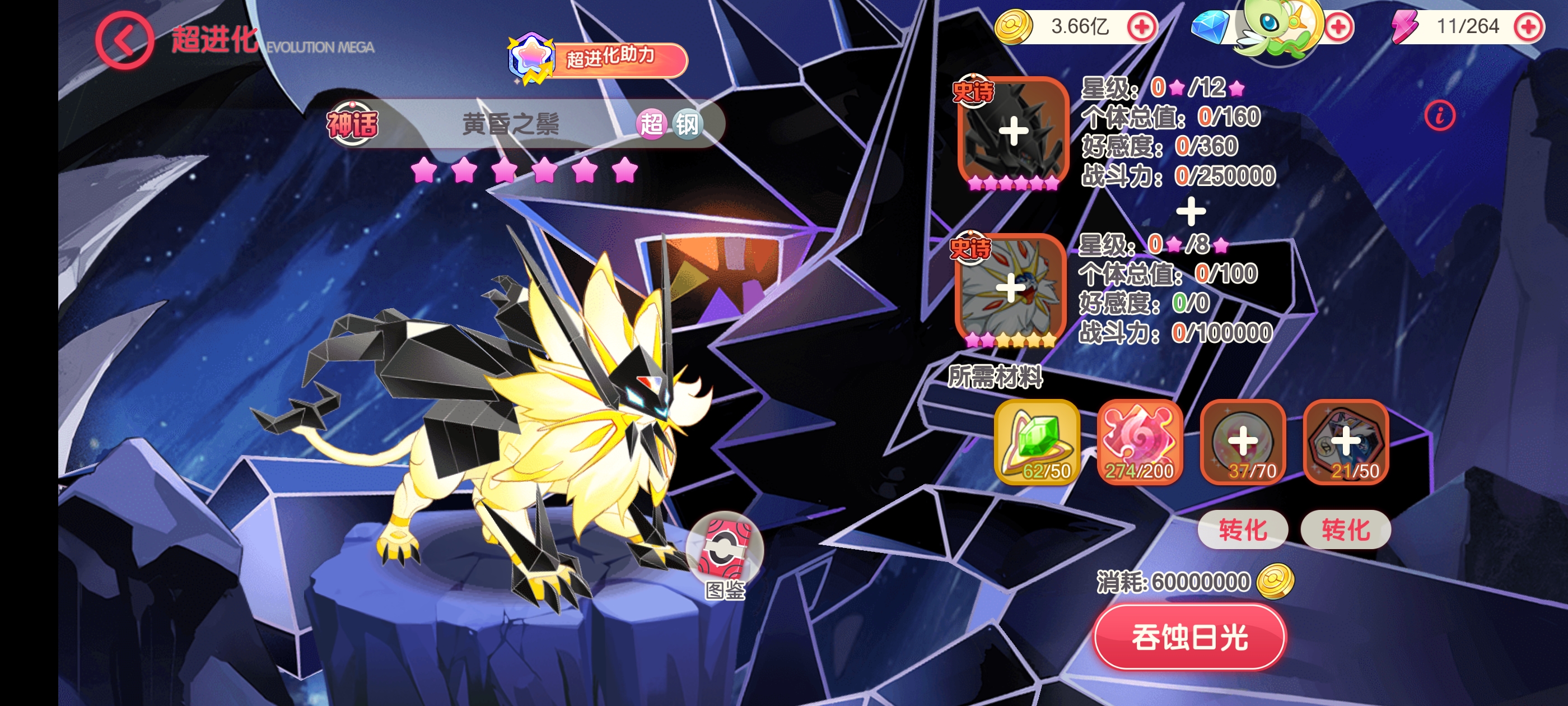 钢队的核心—黄昏之鬃口袋觉醒—新人导师发布于 08-11关注 这期帖子是我根据很多新手想玩钢队,推出的一篇,来说一下需要怎么培养。首先需要到达70级开启超进化才能做这个合体神话黄昏。我们需要12星的奈克洛兹玛(18只)和八星的索尔迦雷欧(7只),总结25只史诗精灵。然后材料需要5只史诗精灵只能是超能钢鬼转化为专属进化石,然后7只任意属性的史诗精灵,转化为通用进化石,总结12只史诗精灵。特别注意这里转化进化石碎片也可以,八个碎片为一个进化石,这里的碎片是指一种精灵的八片。 所以做一只黄昏需要37只史诗精灵。黄昏Z觉醒做到Z6会有巨大提升,但是本期只讲怎么做黄昏。给主播点点赞,点点关注,希望主播的帖子可以帮到大家。