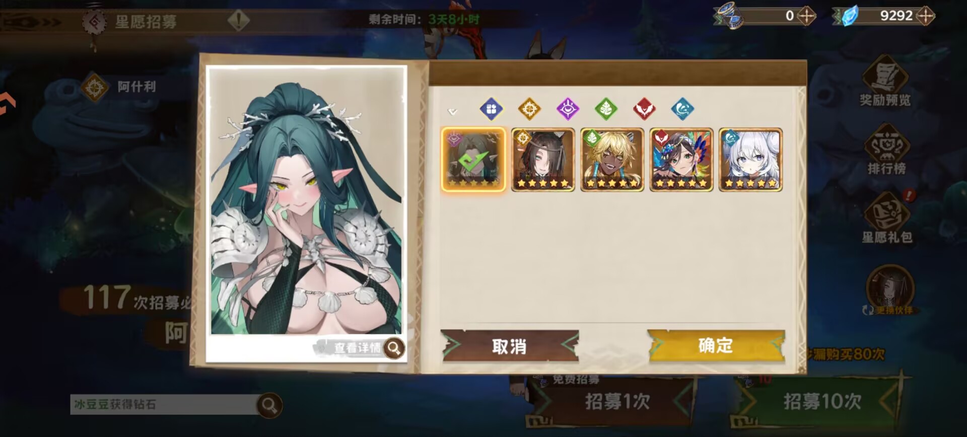 而且你也可以根据你游戏中抽到第一个ssr+级角色来选。比如:你开荒第一个ssr+抽到了【莫斯娜】。