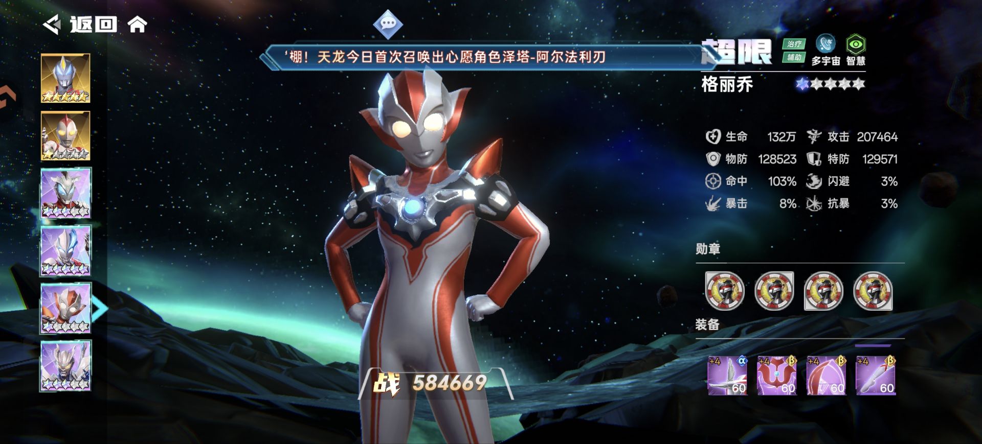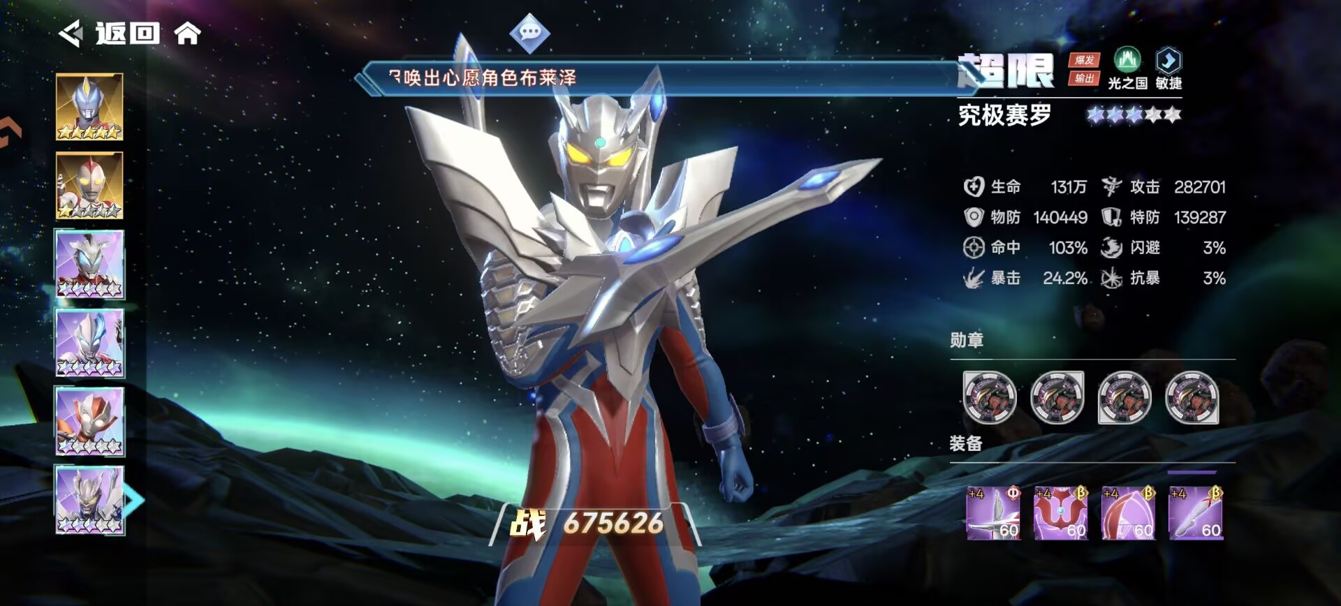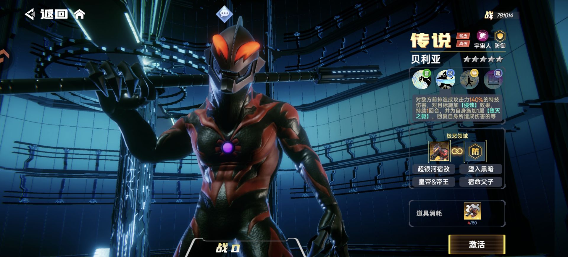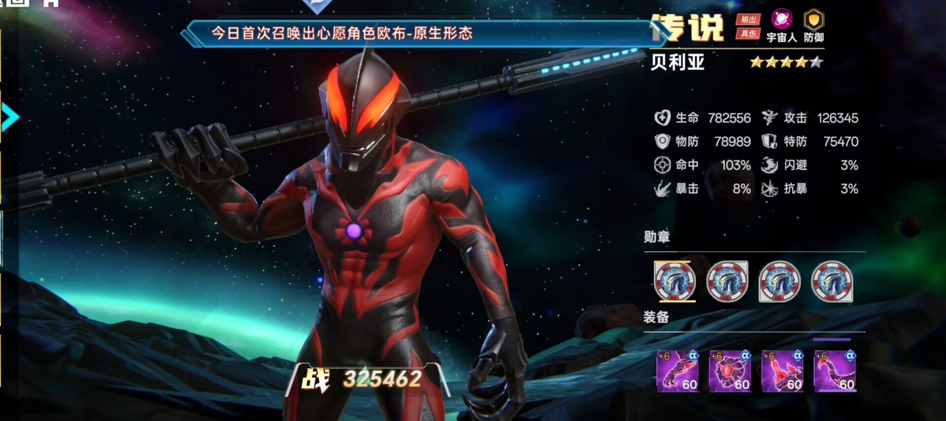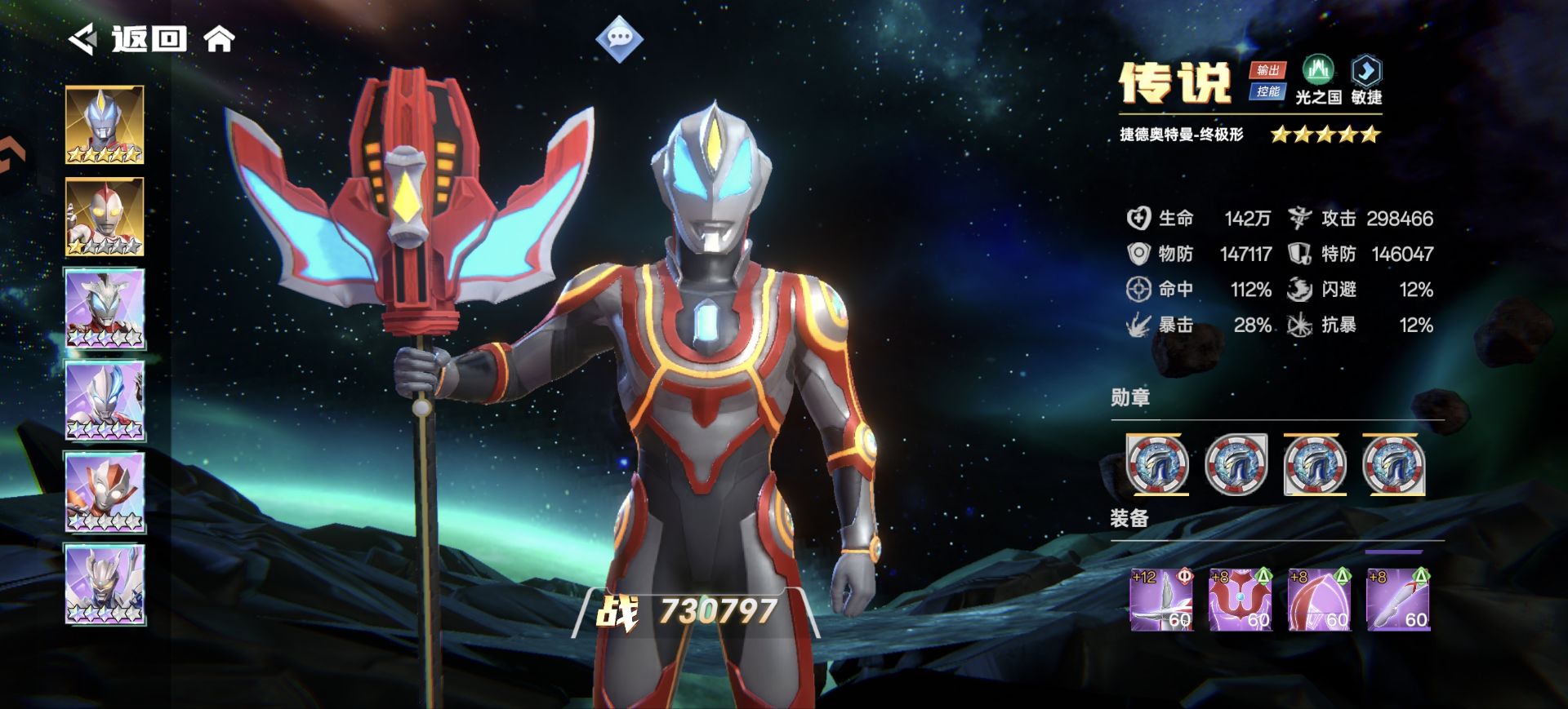 赛罗有条件的玩家可以花30元进化为究极赛罗从而更好的配合贝利亚和布莱泽的输出,起到一个收割残血敌人下效果。