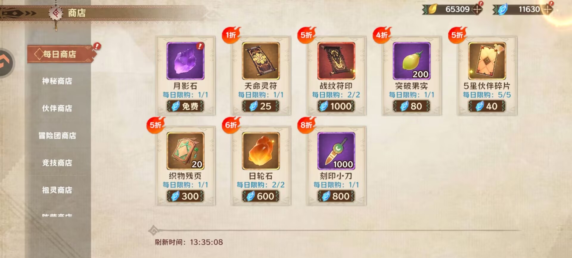 1:优先购买:月影石、天命灵符、突破果实、织物残页。这四种道具比较重要。