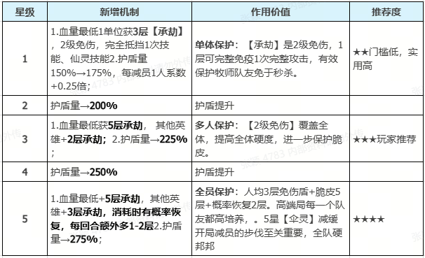 - 3星:★★★(推荐) 全体2层二级免伤,脆皮5层,群体保护的最高性价比。有一定投入的最优选择。