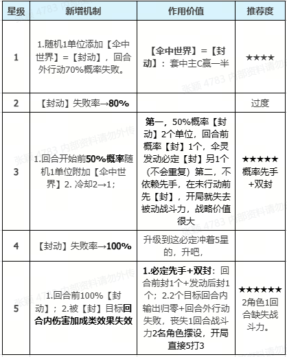 - 觉醒3阶:★★★★★(毕业)1回合冷却+概率【先手】【双封】。提高封C概率,且先手【封】扭转战局劣势。