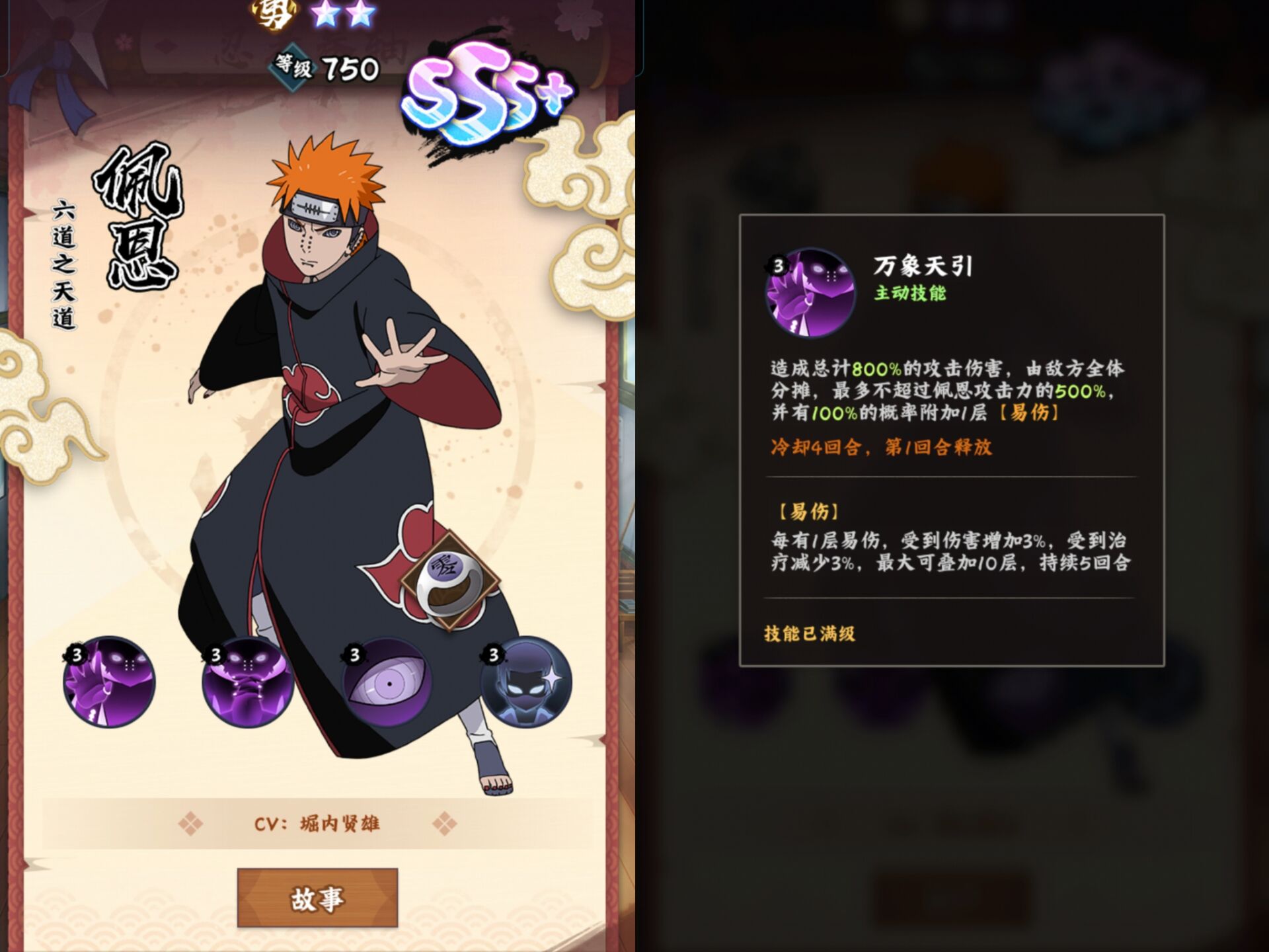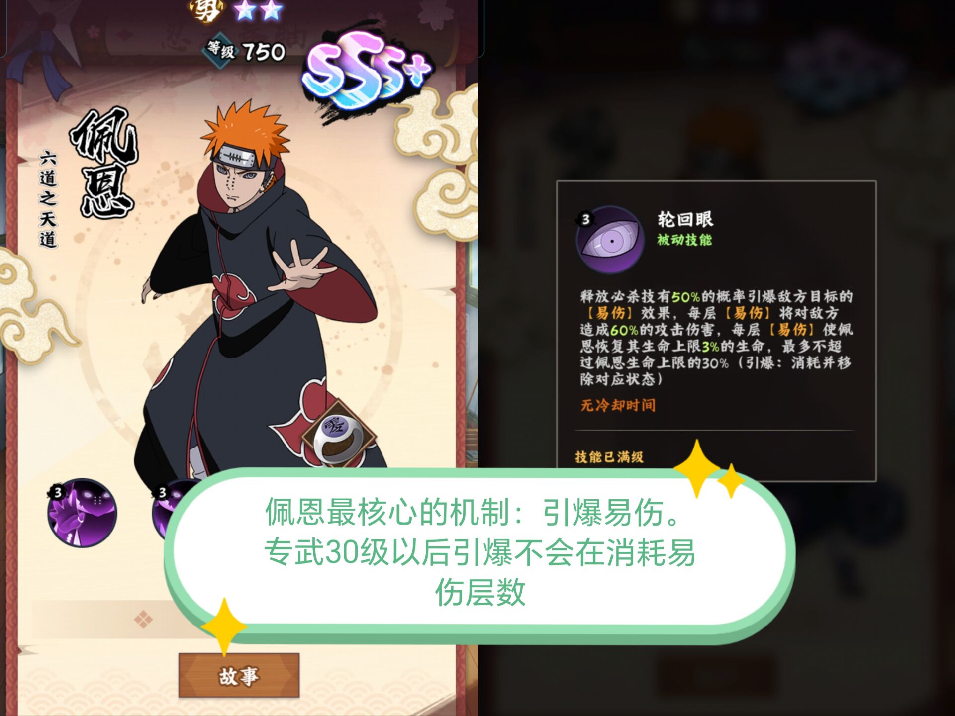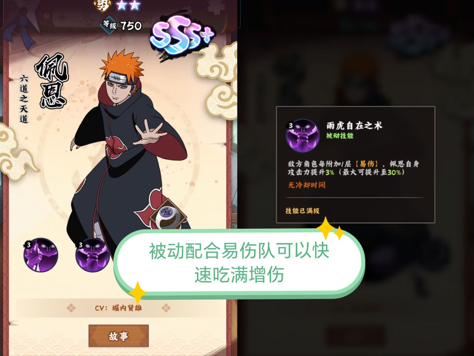 配合团藏的被动队友普攻就可以给敌人挂易伤的基础下,佩恩还是可以做到快速吃满易伤的