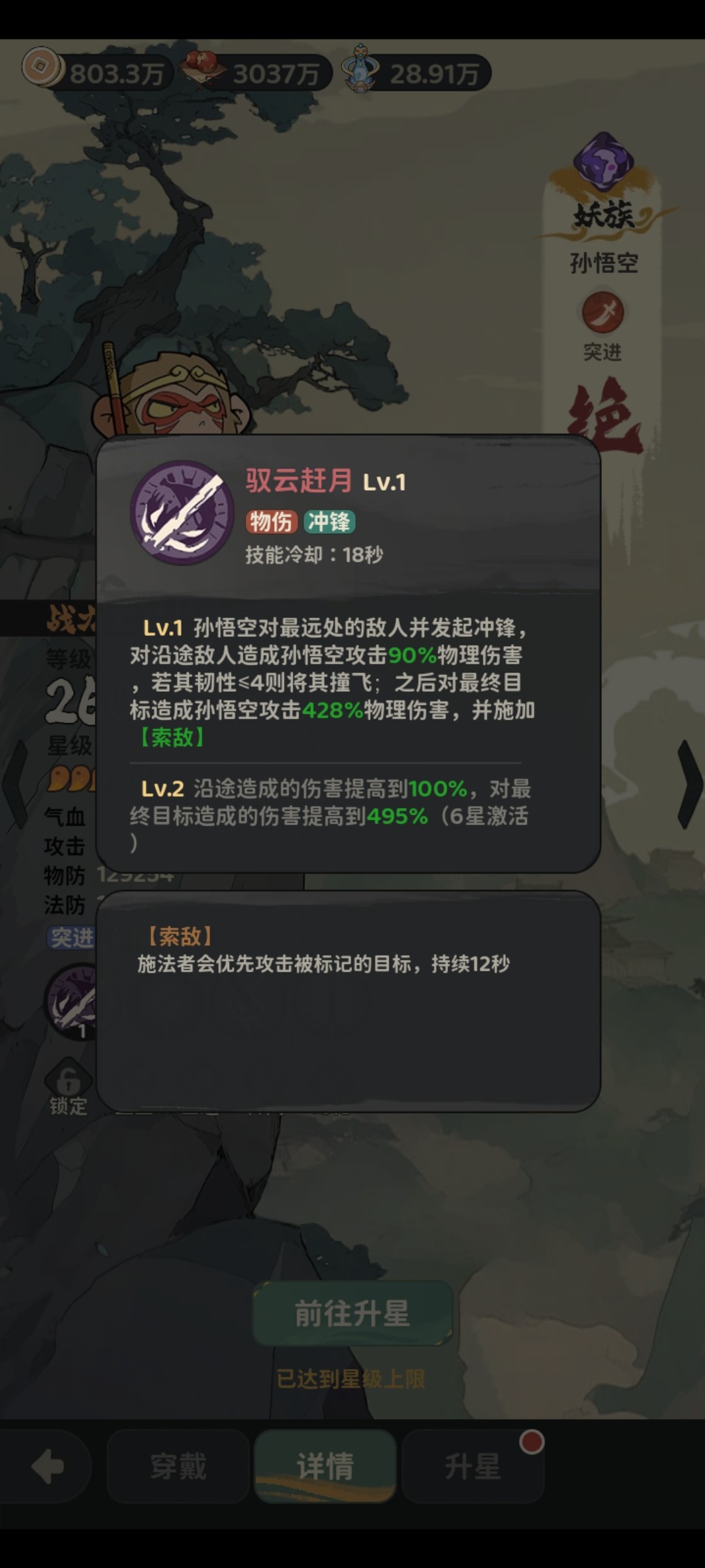 主动技能,瞬间对最远敌人跳过去并对沿途造成90%物理伤害,对主目标造成495%伤害,核心英雄最强主动技能,没有之一,超高单体数值和沿途伤害,圣尊齐天大圣都只有小范围350%伤害,冷却时间18秒比常规12秒高一些,算是平衡了一下伤害。