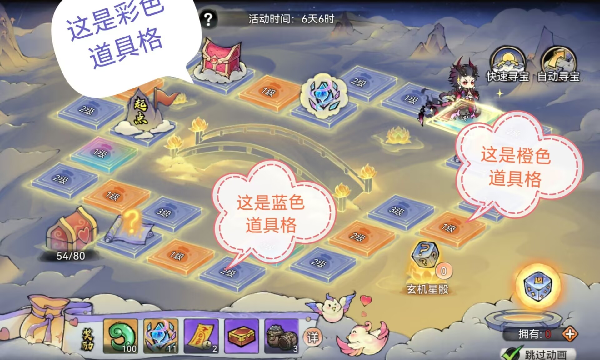 1:星河格子一共有四种奖励类型:分别是:①【道具格】②【珍稀格】③【事件格】④【起点格】。