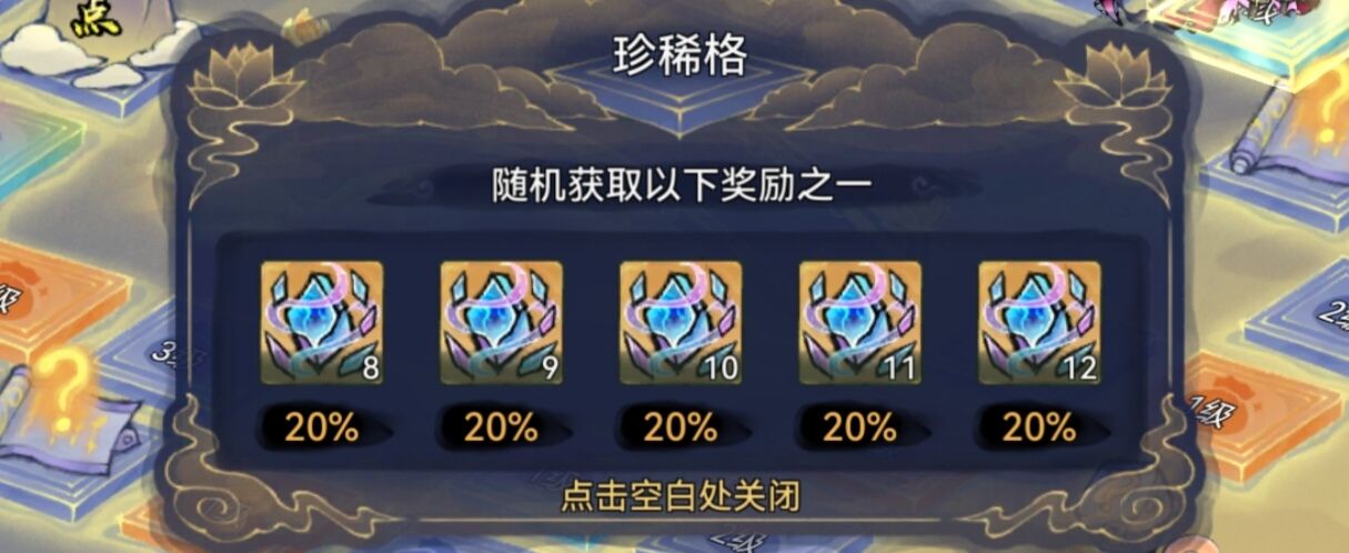 前进过程中:踩中的道具格品质越高,可以获得更多的奖励,奖励是固定的,大家可以参考下图奖励:灵玉、灵草、灵木、灵矿这些奖励。