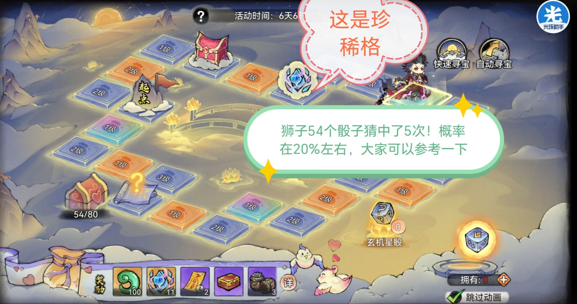 狮子个人投掷了54次骰子,踩中了5次珍稀格概率大约就是20%左右!这个概率也还算可以也并不会太坑。