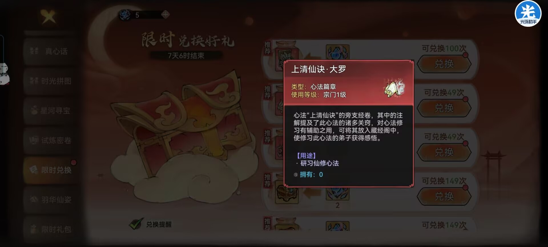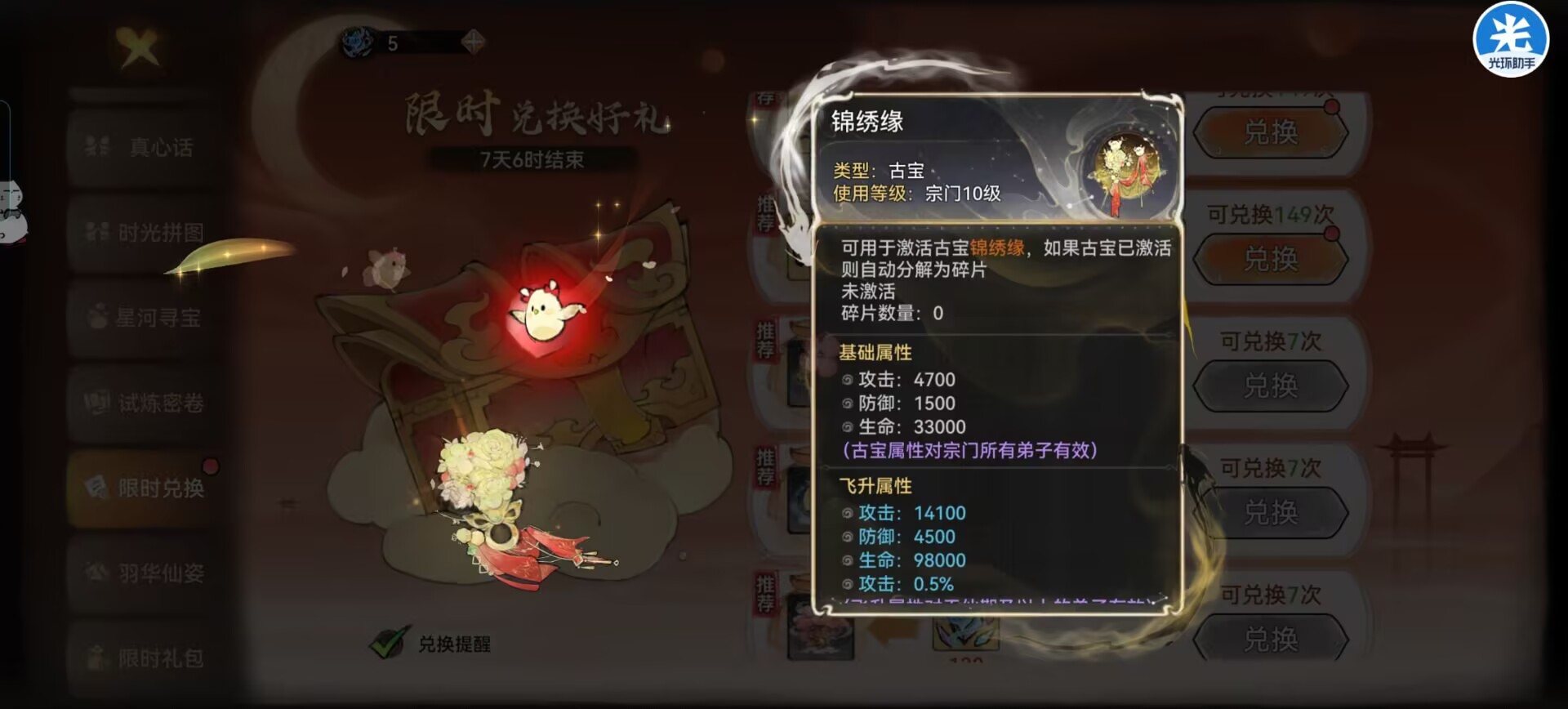 兑换了一套橙色古宝,还有心法等。
