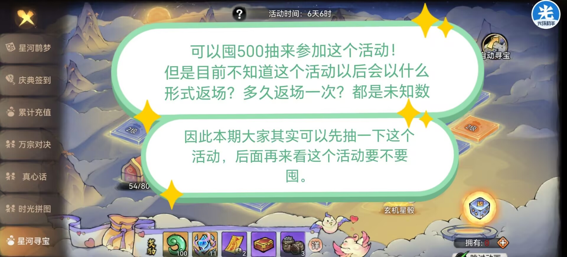 二:【星河寻宝】参加建议。又是一个需要消耗大量灵玉的囤囤活动,因为星河骰子是可以永久保留的。