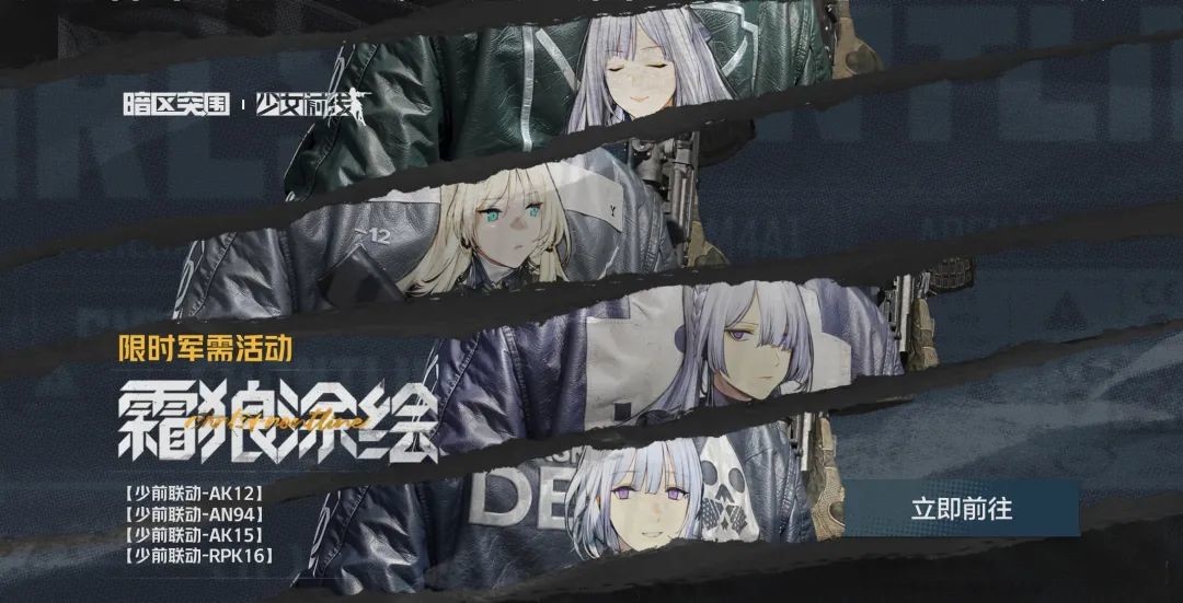 霜狼涂绘 夹克【少前联动·AK12】【少前联动·AK15】【少前联动·AN94】【少前联动·RPK16】四款少前联动夹克限时返场,分别对应少女前线忤逆小队里的四个成员!![]()