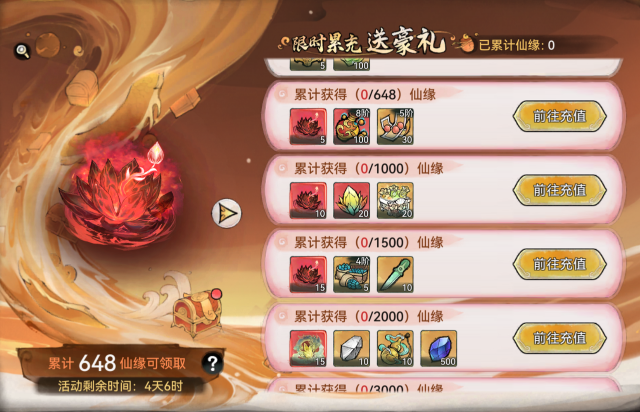 活动期间,祖师累计充值达到一定数量,还可领取真灵精血、天机万象匣、珍稀灵秀碎片等道具奖励,感兴趣的祖师届时可以了解下哦~