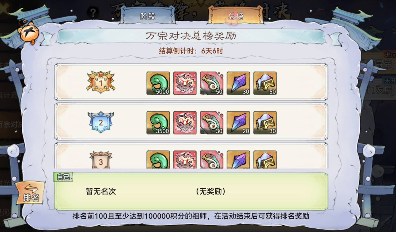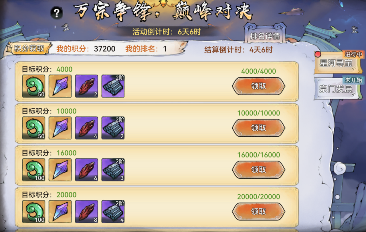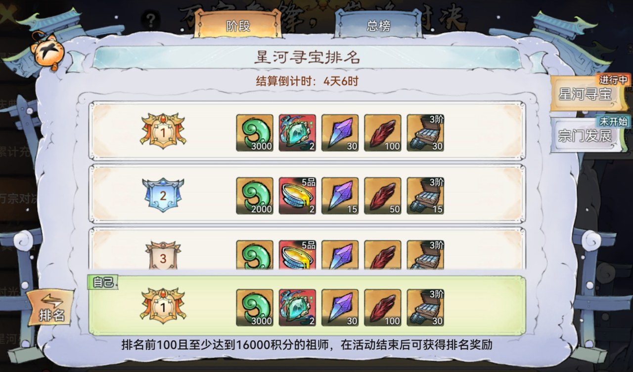 活动期间,部分满足要求的区服将陆续开启星河寻宝、宗门发展等阶段比拼,祖师完成阶段主题相关的操作即可获得积分。