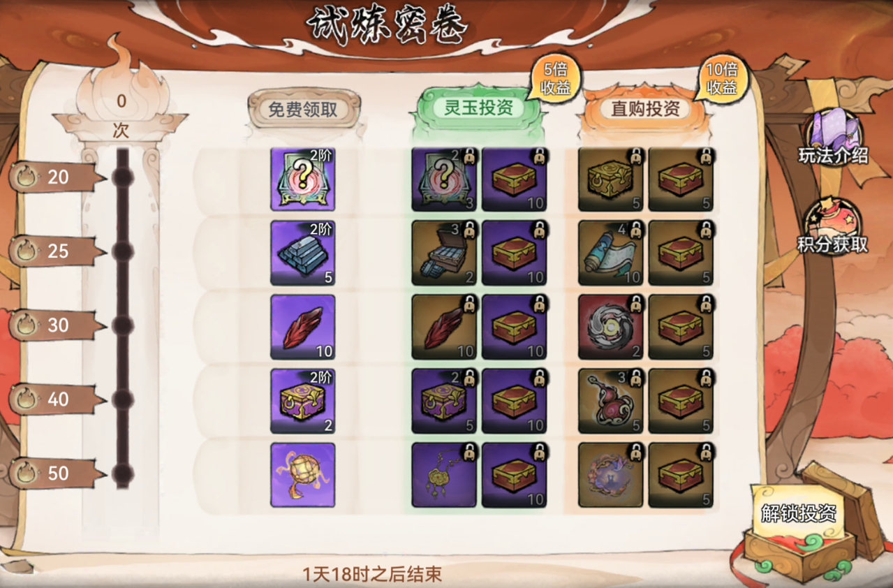 累计一定的寻宝次数后,祖师还可免费取星墟破片、星尘石英等进度奖励和试炼密卷奖励。若祖师感兴趣,还可通过解锁投资的形式获取混沌源气等进阶奖励。