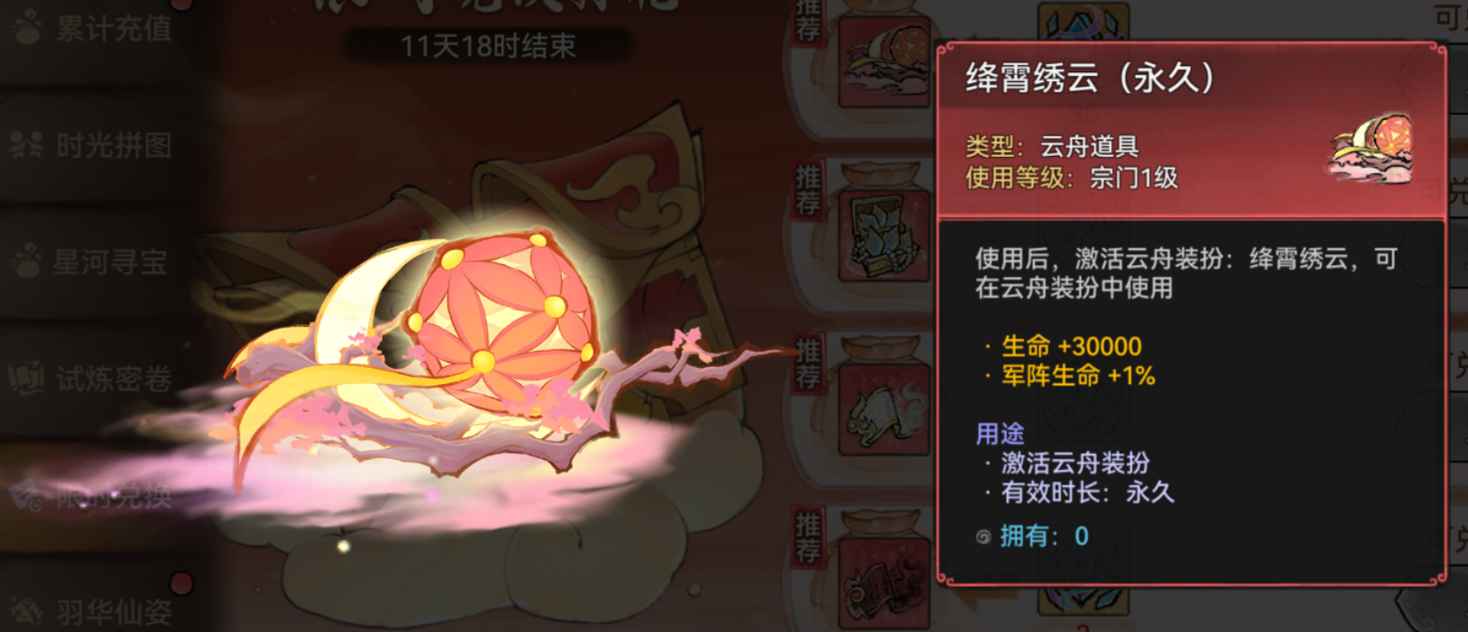 在寻宝过程中获得的星墟破片可在【限时兑换】活动中兑换限定云舟装扮-绛霄绣云、全新混沌古宝、限定祖师装扮、限定宗门装扮,以及仙魔心法等珍稀道具。