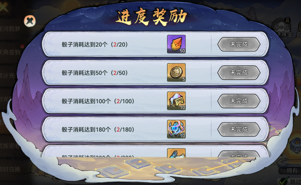 活动期间,祖师通过消耗星河宝骰可在传说中的星河上寻宝。