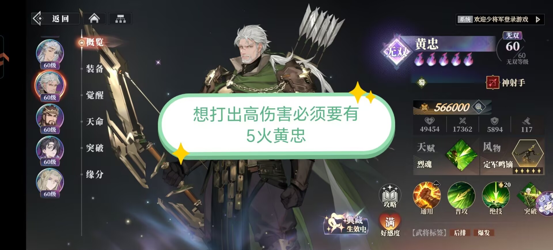 1:高分基础要求第一点:必须有5火黄忠。