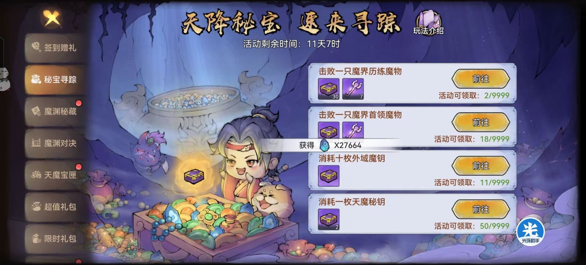 1:签到赠礼。2:秘宝寻踪。3:魔渊秘藏。