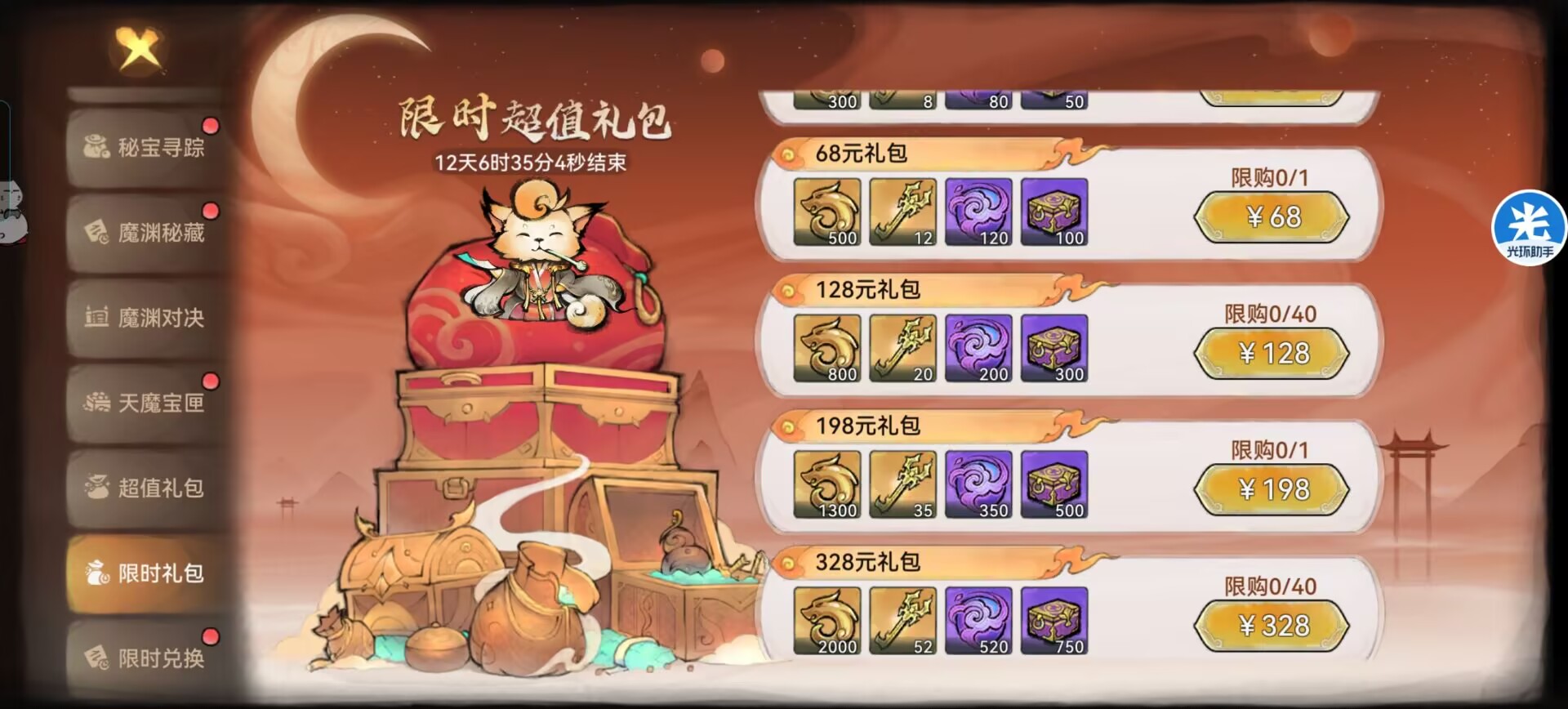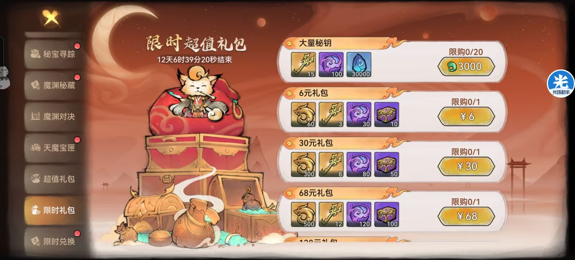 不过这个商店需要大量的天魔核兑换,平民玩家不买3000灵玉礼包是兑换不了多少东西的,买要3000灵玉礼包+开天魔宝箱,最多也只有3000多天魔核,兑换不了红色古宝的。