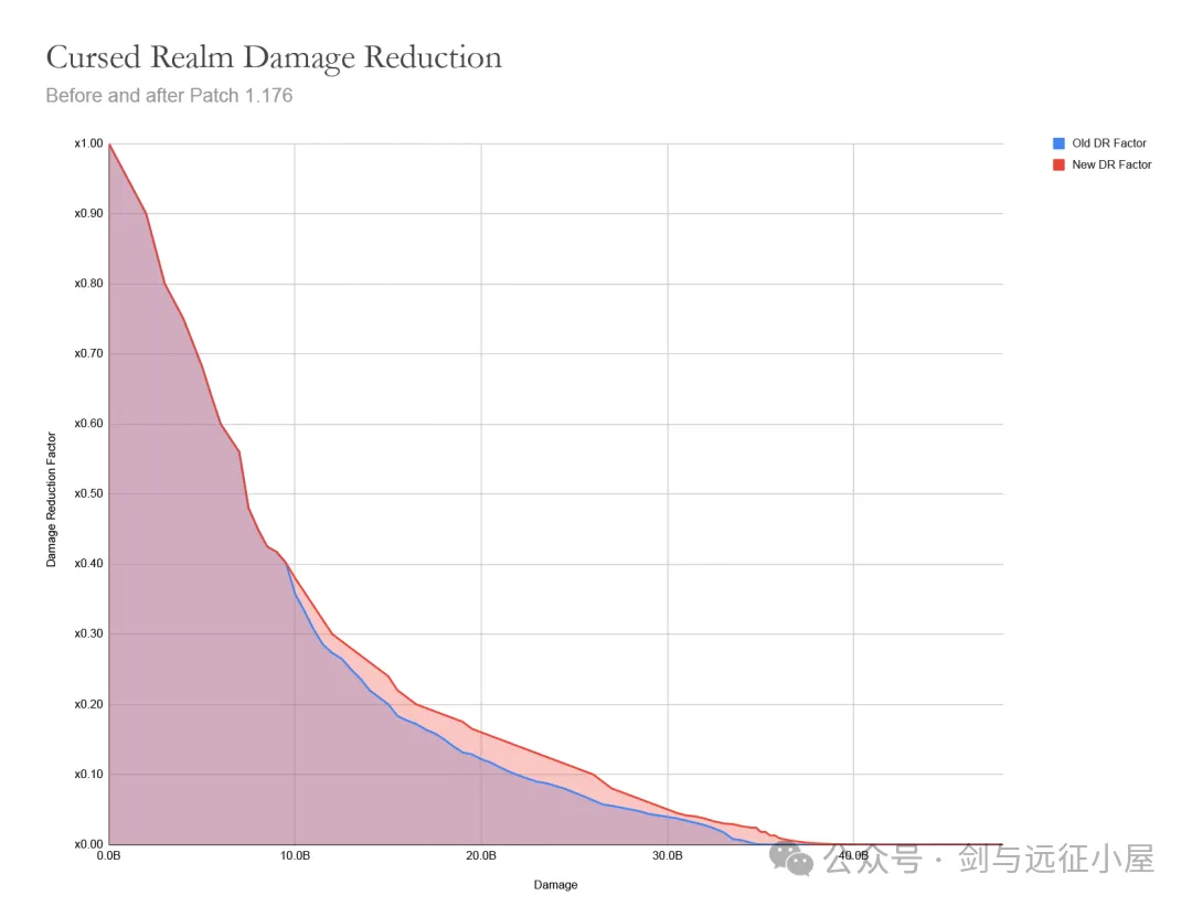 随着伤害上限的提高,怒气机制也进行了调整。旧的伤害减免效果和新的伤害减免效果保持不变,但在 10b 左右有所不同。之后,伤害减免效果的缩放速度比以前慢了一点。35b 目前在大多数回合中都是顶级或接近顶级的伤害,此时的伤害减免除数略高于 4000。在新的 诅咒中,我们要到 40b 左右才能达到这个减伤水平。因此,即使没有更好的配队或增益,我们也可以预期分数会立即大幅增加。(见下图)