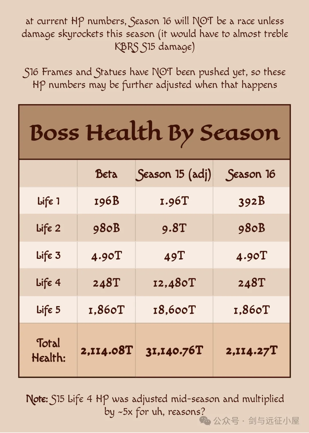 五周目血量对于任何公会来说都无法杀死,除非设法将队伍的最高伤害提高三倍。虽然我们已经姗姗来迟了,而且我们可以在下一个补丁获得它,但三倍伤害只是......没有发生。不过莉莉丝还没有推动 S16 的新雕像或框架,可能会有更多的变化。他们之前在赛季开始前多次调整 Boss 生命值。
