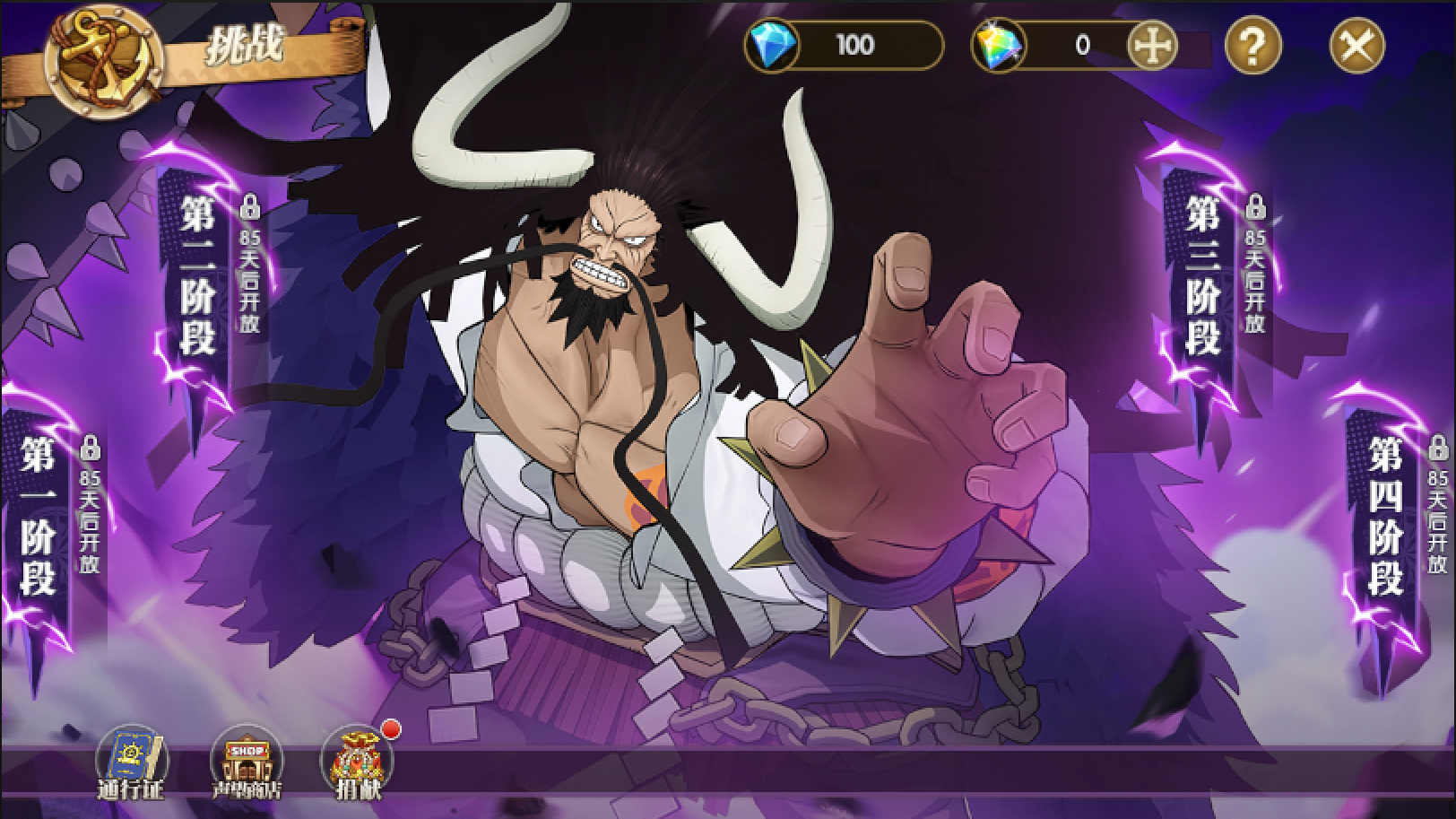 凯多挑战这里也开始宣传了,里面四个阶段,每个阶段都有时间,同时有一个捐献还有通行证,商店应该是积分用来换奖励的