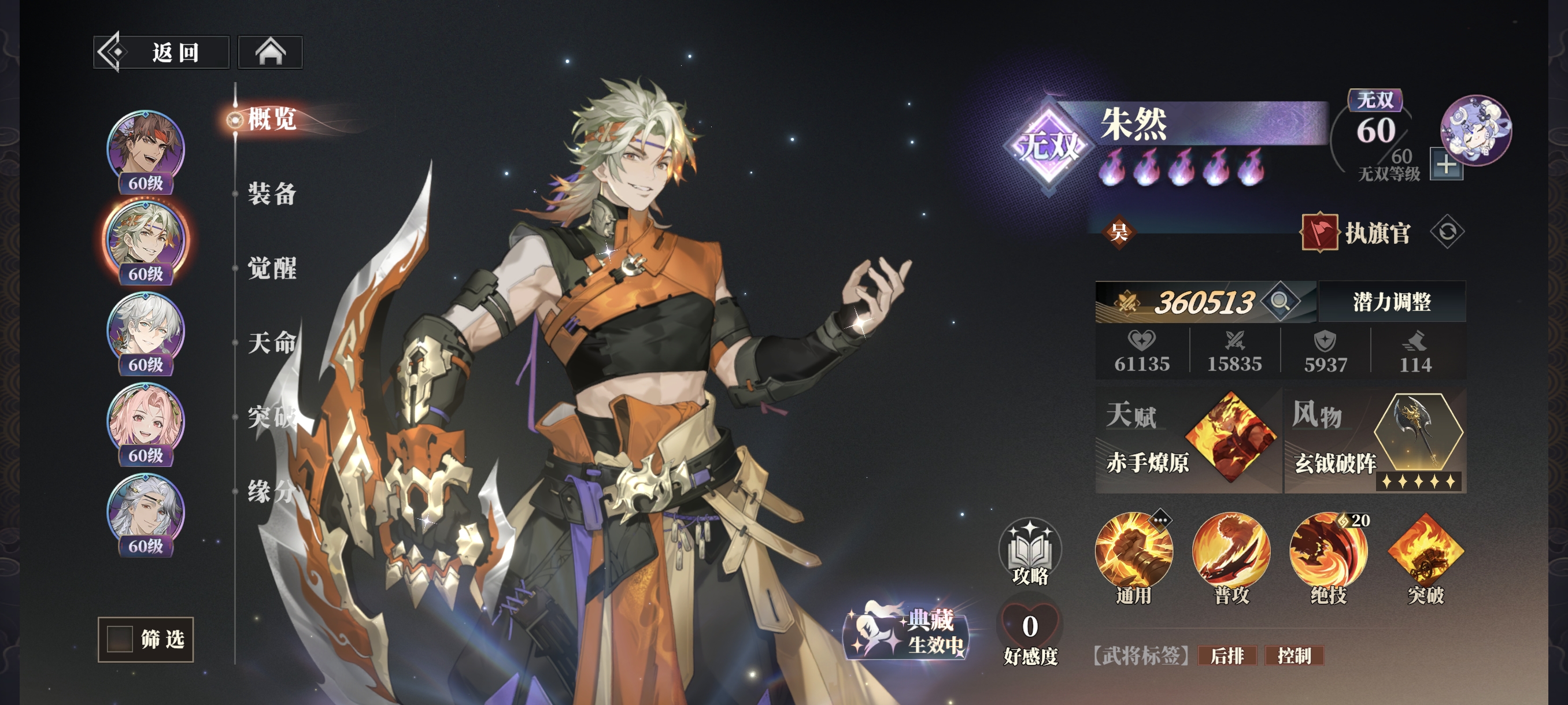 它的三个特性:永久加速度、绝技眩晕、永久加攻击,都完美契合朱然的机制。