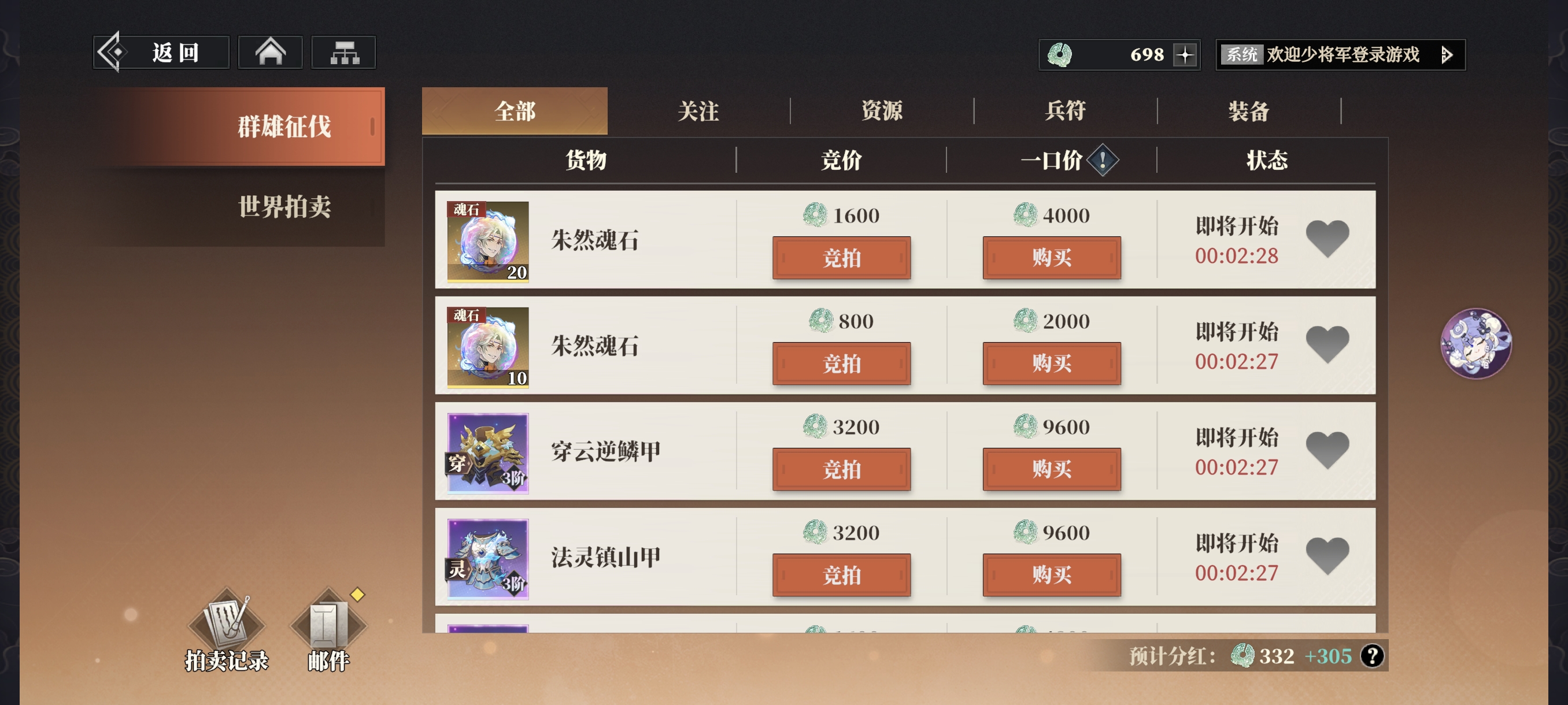 朱然是首个以拍卖形式出场的武将,仅能通关每晚8点的拍卖获取,底价为4800三山壁/个,一口价为1.2W/个,专属风物-玄钺破阵还需要公会BOSS等级和排名达到一定名次才能出现在拍卖中。