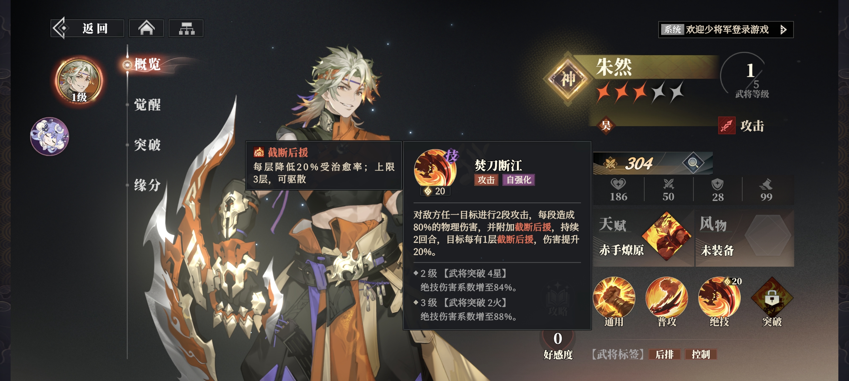 但朱然本身并不是输出定位的武将,所以伤害也不是重点,而是绝技附加的特效【截断后援】,每层可降低目标20%受治愈率,并提高20%绝技伤害,上限3层,可驱散。