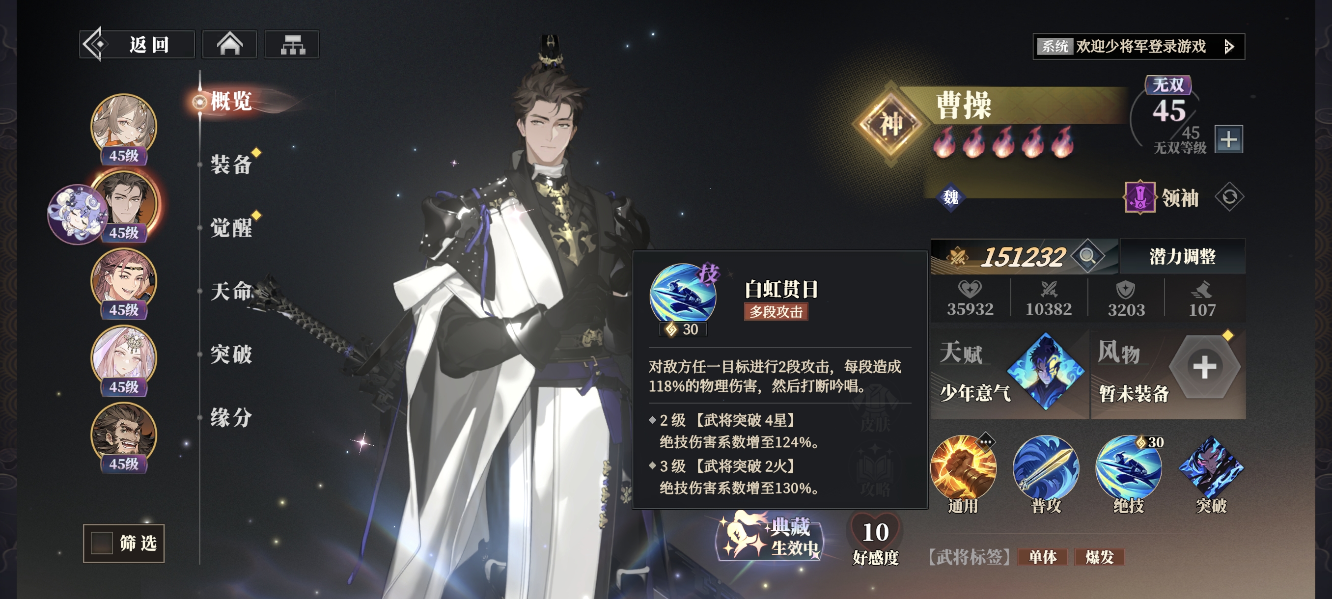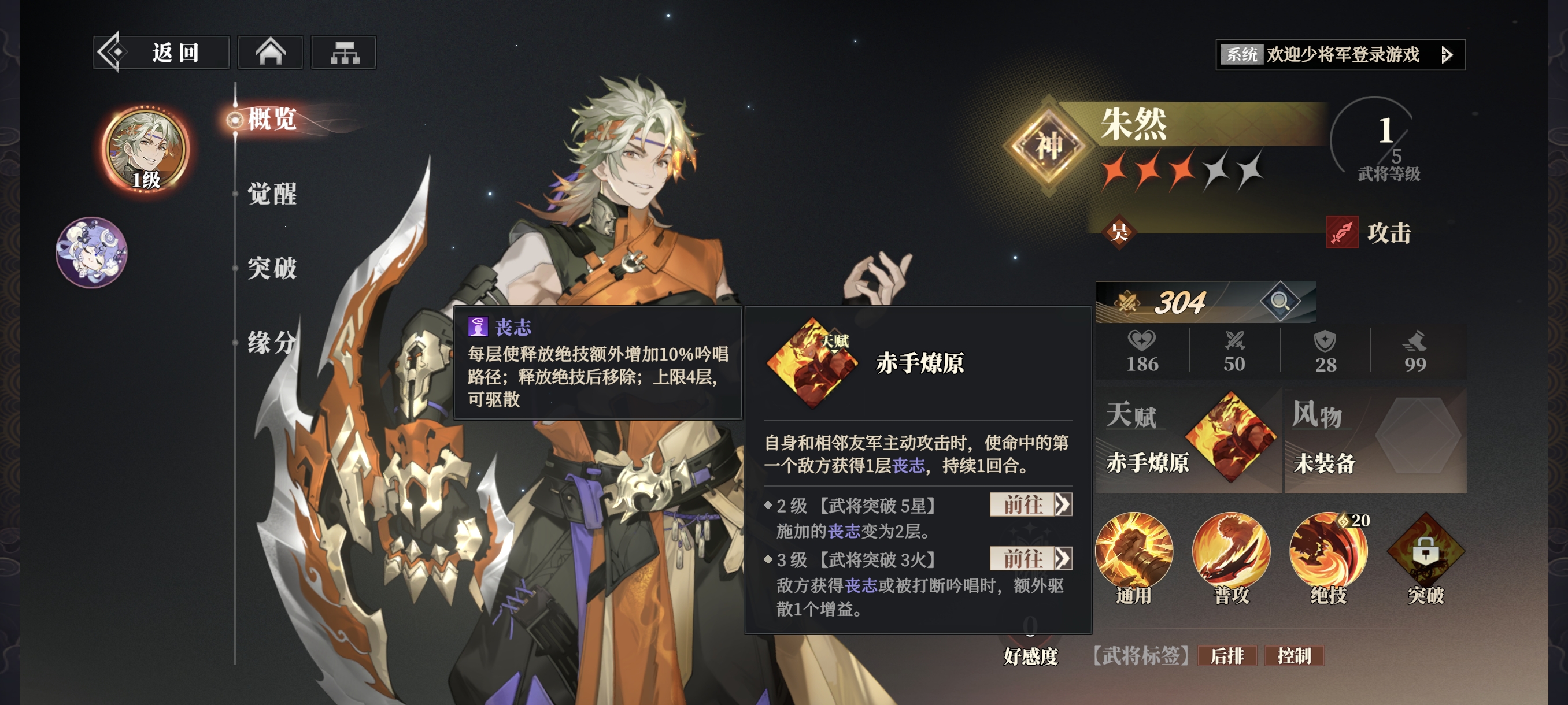 朱然自身99速度较慢,开场获得1层【机敏】可将其速度提升至104,并且绝技施放频率很快,可以迅速叠满10%速度加成,提升出手频率。